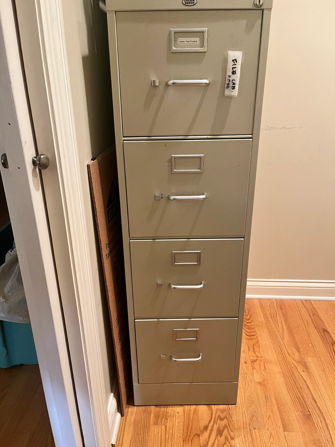 Sturdy metal 4-drawer file cabinet in great condition. Perfect for home office, school, or business use. Smooth drawer action with label holders and locking capability (key not included). Neutral beige color fits any space. Clean and ready to organize your life!
