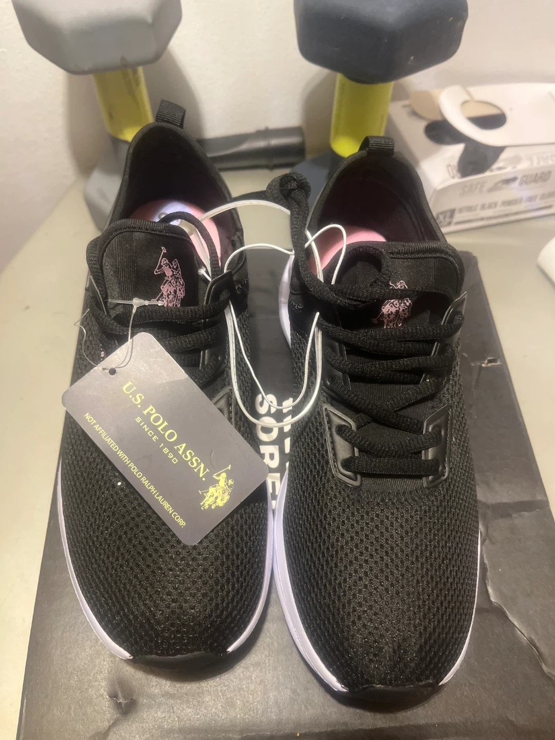These U.S. Polo Assn. sneakers are black with pink accents and a mesh upper. They feature a lace-up closure and a durable rubber sole. Women's size 8.5.