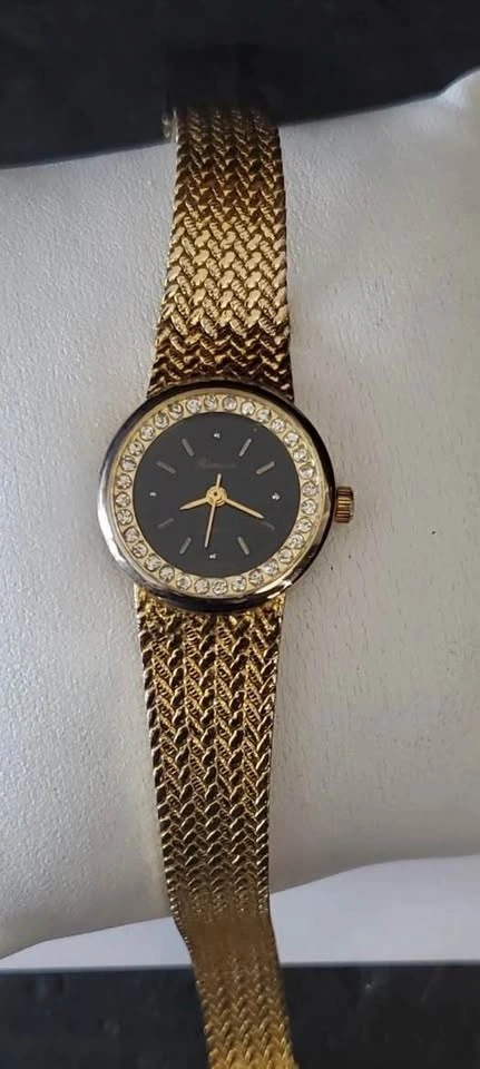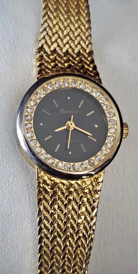 Ronica Ladies Gold Plate Watch - Rhinestones, Black Dial, New Ba