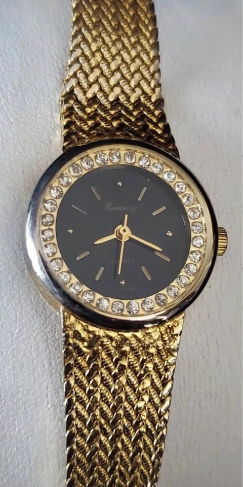 This Ronica Ladies Everyday watch is a stylish and elegant timepiece, perfect for daily wear. It features a gold-plated case with a black dial and sparkling rhinestone accents, adding a touch of sophistication. The left-handed design is a unique detail. It has a reliable quartz movement and a 12-hour dial. The bracelet band with a jewelry clasp closure ensures a comfortable and secure fit, and the polished finish gives it a luxurious look. This watch is a versatile accessory, suitable for both casual and formal occasions.
