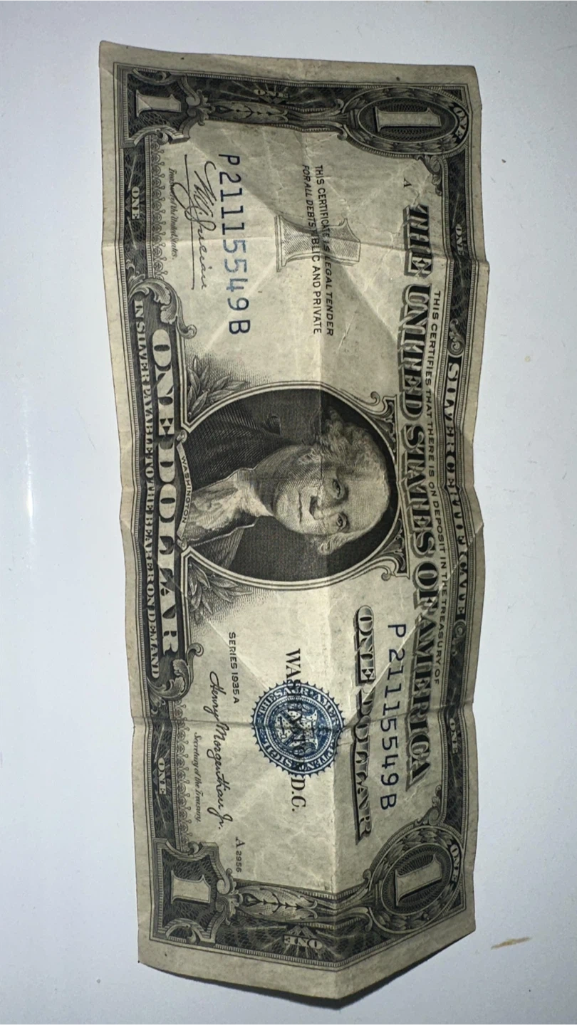 This is a 1935A United States Silver Certificate one dollar bill. It features George Washington on the obverse and a depiction of the Great Seal on the reverse. This note was redeemable for one dollar in silver on demand.