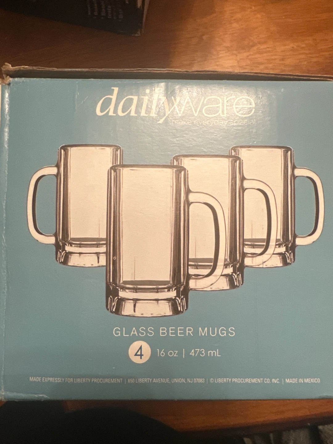 Selling a set of 4 Dailyware glass beer mugs! They are 16 oz / 473 mL each and come in the original box. Perfect for everyday use or special occasions, these mugs are a great addition to any home bar
