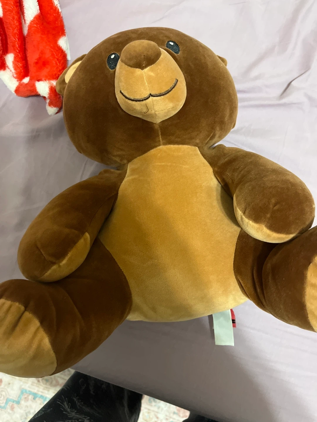 Super soft brown teddy bear plush toy. It has a tan belly and cute embroidered facial features. This huggable friend is perfect for playtime or as a comforting companion.