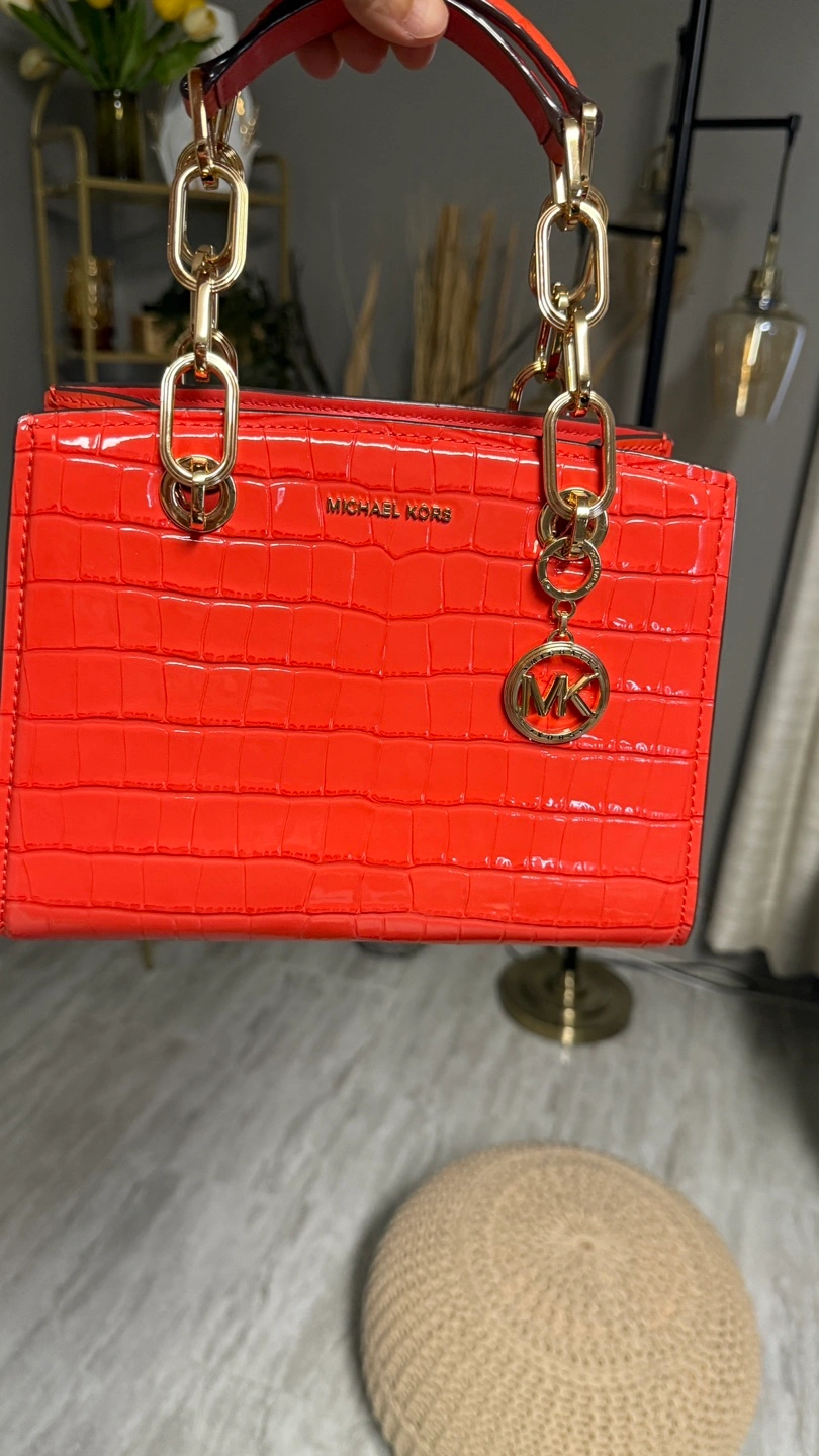 Bright orange crocodile-embossed satchel. Gold chain strap and MK charm. Small and stylish.