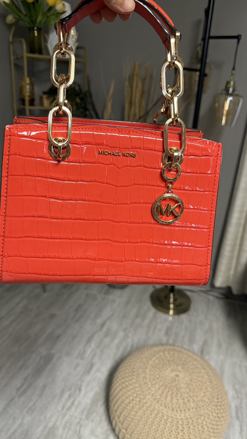 Bright orange crocodile-embossed satchel. Gold chain strap and MK charm. Small and stylish.