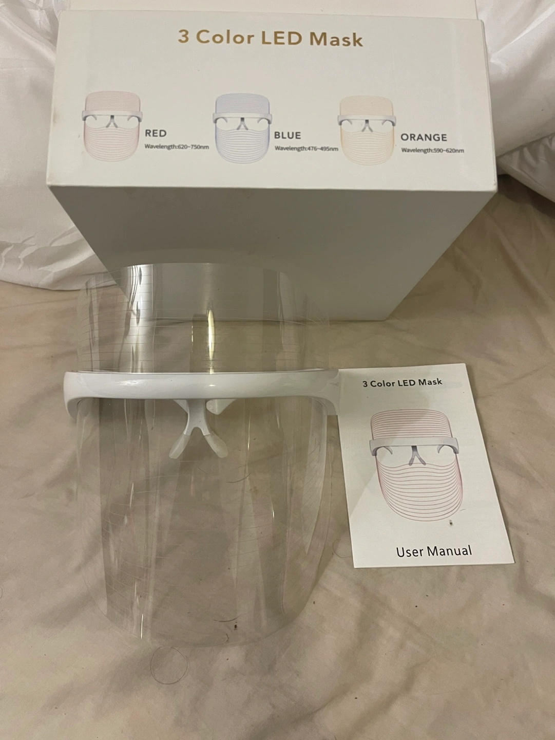1000+LED face mask. Three colors: red, blue, and orange. Includes user manual. Wavelengths specified on box.