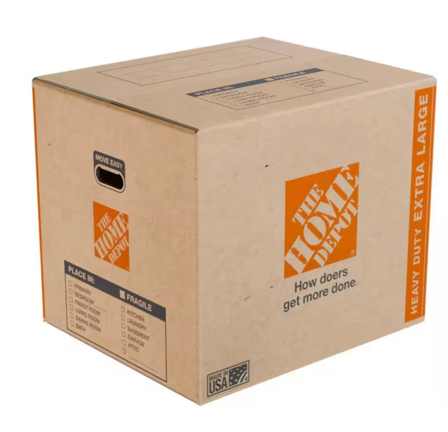 519Selling 3 counts heavy-duty extra-large moving boxs 24X21X20 from The Home Depot! It's perfect for packing up your belongings for a move or for storing items in your attic or garage. The box has designated areas to mark the room it belongs to and whether it's fragile. It also has convenient handles for easy moving