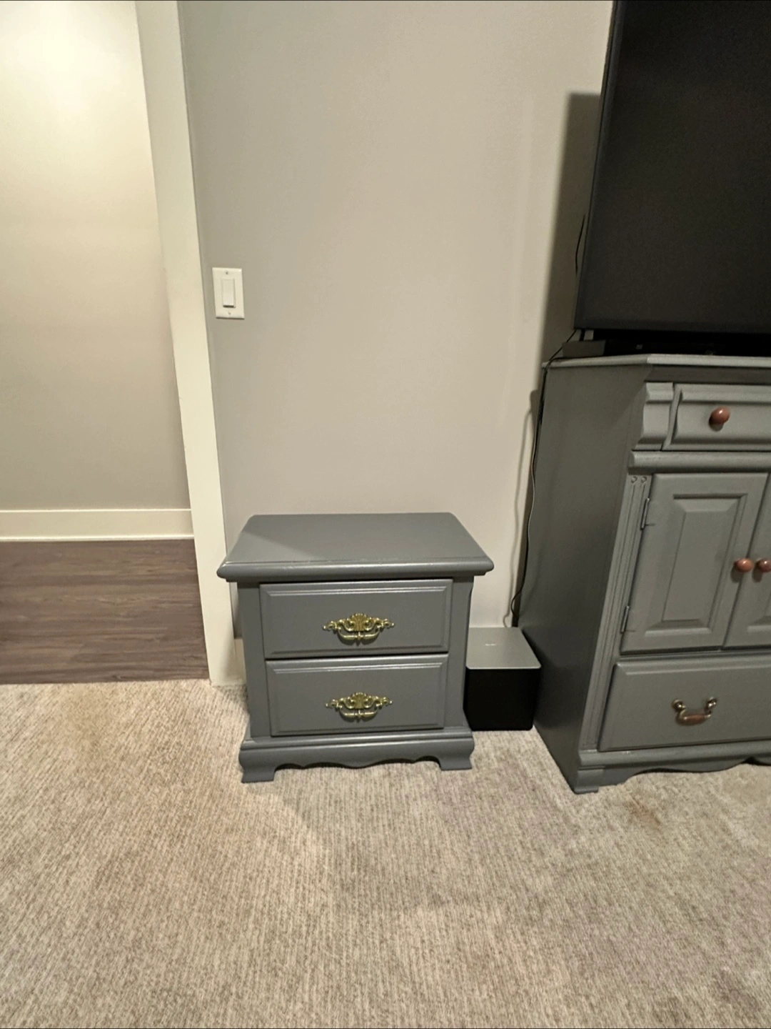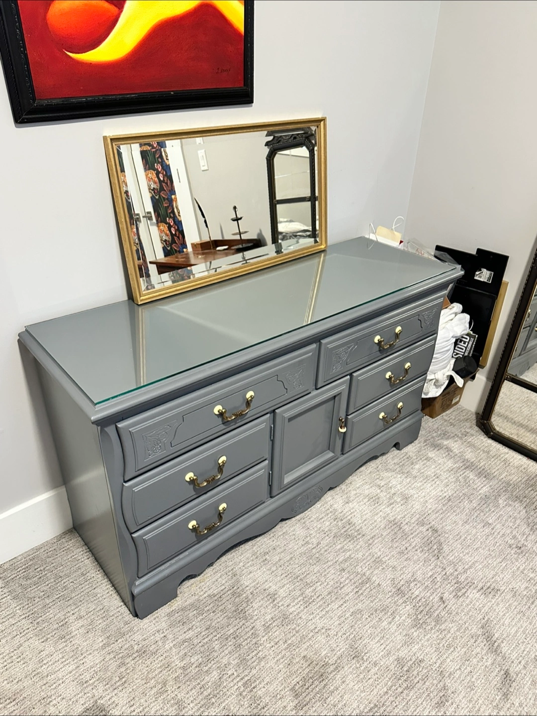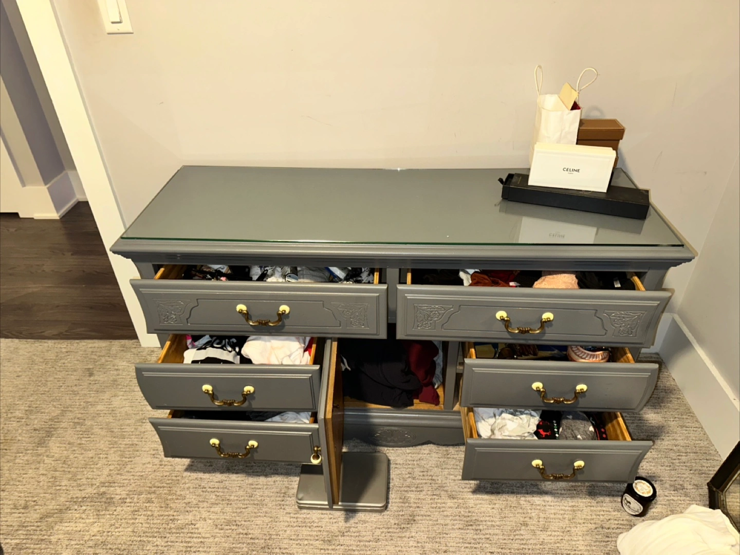 Moving Sale - Selling a matching set of Broyhill gray painted wood furniture! Includes a nightstand and three dressers. They're in great condition and would look great in any bedroom. 3 Dressers (Long & Tall with Custom Tempered Glass Tops, Solid Wood Construction) & 4 End Tables - sets of two each. Premium Quality, Timeless Craftsmanship. TONS of storage space. Swap out the knobs for a different look. Tall dresser measures approximately 48 inches in length, 17 inches wide and 48 inches long. Solid wood. Short wide l dresser with a glass top. It measures approximately 54 inches in length, 17 inches in width, and 30 inches in height. 2nd tall dresser is 48 inches in length, 35 inches in width, and 17 inches in height. Pick-Up Only at 16th & Halsted, Just South of UIC Campus. Solid construction all natural wood. Pick up in Chicago SMOKE FREE HOME. Check out my other listings BELOW. I’m moving out of the country and need to sell 3000 SF of furniture out of a newer home. Check out this ‘Dyson V7 Animal Stick Vacuum’ on Karrot! The local community marketplace app: https://ca.karrotmarket.com/buy-sell/6126075 Check out this ‘28 Bottle Wine Refrigerator - 16.9" x 17.7" x 33.1"’ on Karrot! The local community marketplace app: https://ca.karrotmarket.com/buy-sell/6036860 Check out this ‘Sonos Arc, Sub G3 & (QTY 2) One SL US (Black)’ on Karrot! The local community marketplace app: https://ca.karrotmarket.com/buy-sell/5951236 Check out this ‘Thomasville Tisdale Modular Sectional Dark Gray’ on Karrot! The local community marketplace app: https://ca.karrotmarket.com/buy-sell/6035876 Check out this ‘3 Dressers plus + 4 matching End Tables - Glass Tops’ on Karrot! The local community marketplace app: https://ca.karrotmarket.com/buy-sell/6075188 Check out this ‘Tundra Hut Portable Sauna - XL Size’ on Karrot! The local community marketplace app: https://ca.karrotmarket.com/buy-sell/6092441 Check out this ‘Four (4) Ultra Comfort XL Folding Chairs’ on Karrot! The local community marketplace app: https://ca.karrotmarket.com/buy-sell/6091720 Check out this ‘8ft Fold-in-Half Black Banquet Table’ on Karrot! The local community marketplace app: https://ca.karrotmarket.com/buy-sell/6091688 Check out this ‘Wood and Metal Style Bed Frame + Metal Box Spring’ on Karrot! The local community marketplace app: https://ca.karrotmarket.com/buy-sell/6037014 Check out this ‘13 Pairs - OG AIR Jordan 1 Mid - Epic Bundle -Size 14’ on Karrot! The local community marketplace app: https://ca.karrotmarket.com/buy-sell/5950966 Check out this ‘Christian Louboutin Slingback Heels Black Suede Python Size 6.5’ on Karrot! The local community marketplace app: https://ca.karrotmarket.com/buy-sell/6036471 Check out this ‘Gray Leather Sectional Left & Right Facing Chaise Sofa + Ottoman’ on Karrot! The local community marketplace app: https://ca.karrotmarket.com/buy-sell/6036382