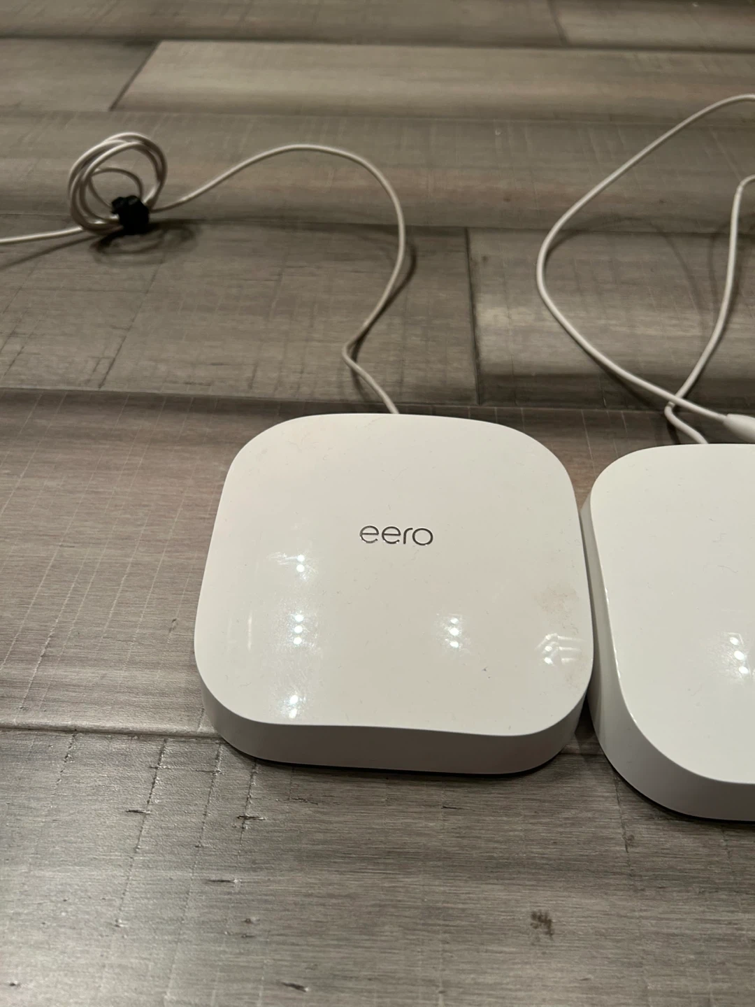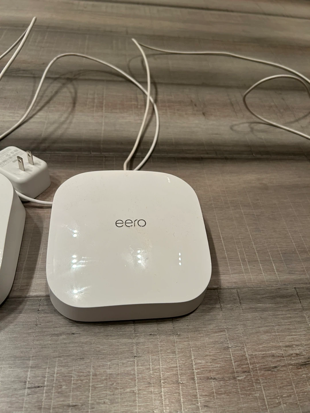 Selling an eero Mesh WiFi System. The eero Pro 6 Tri-Band Mesh Wi-Fi 6 Router is a wireless-ac Wi-Fi system that can provide speeds of up to a gigabit and can cover up to 2,000 sq. ft. It can handle over 75 connected devices and has a built-in Zigbee smart home hub. This system helps create a strong and reliable WiFi network throughout your home. It includes the necessary components to get you connected. Perfect for improving your internet experience!
