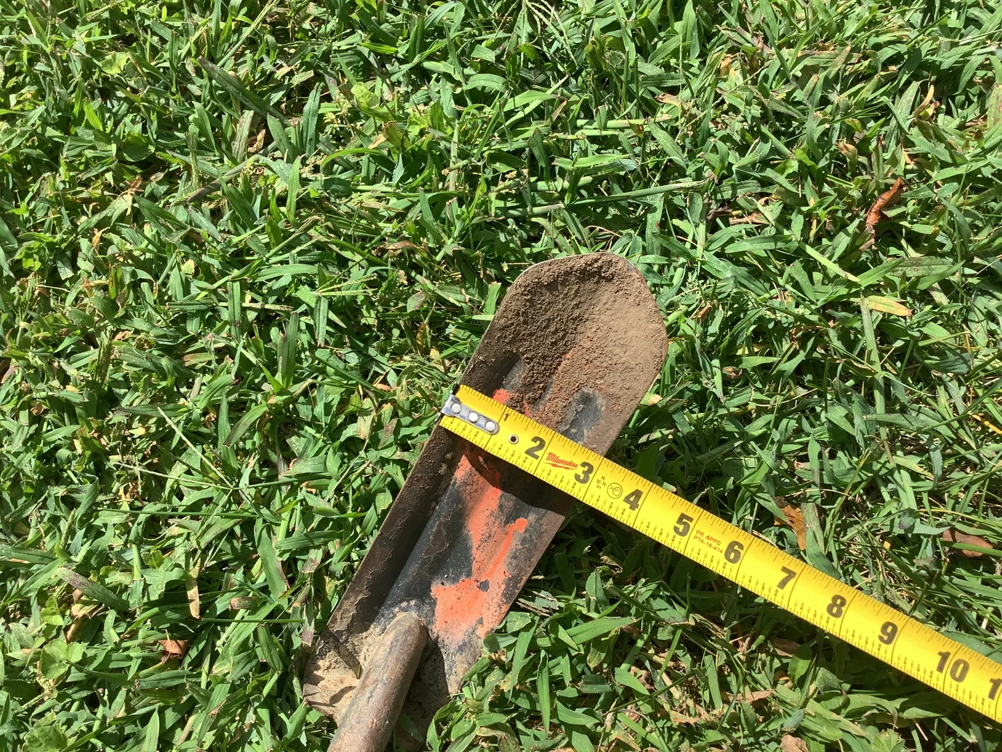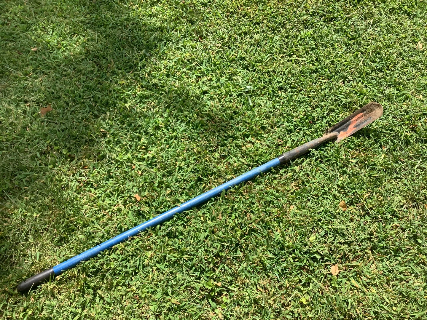 Selling a used garden shovel. It's about 40 inches long with a blue handle and a metal blade.