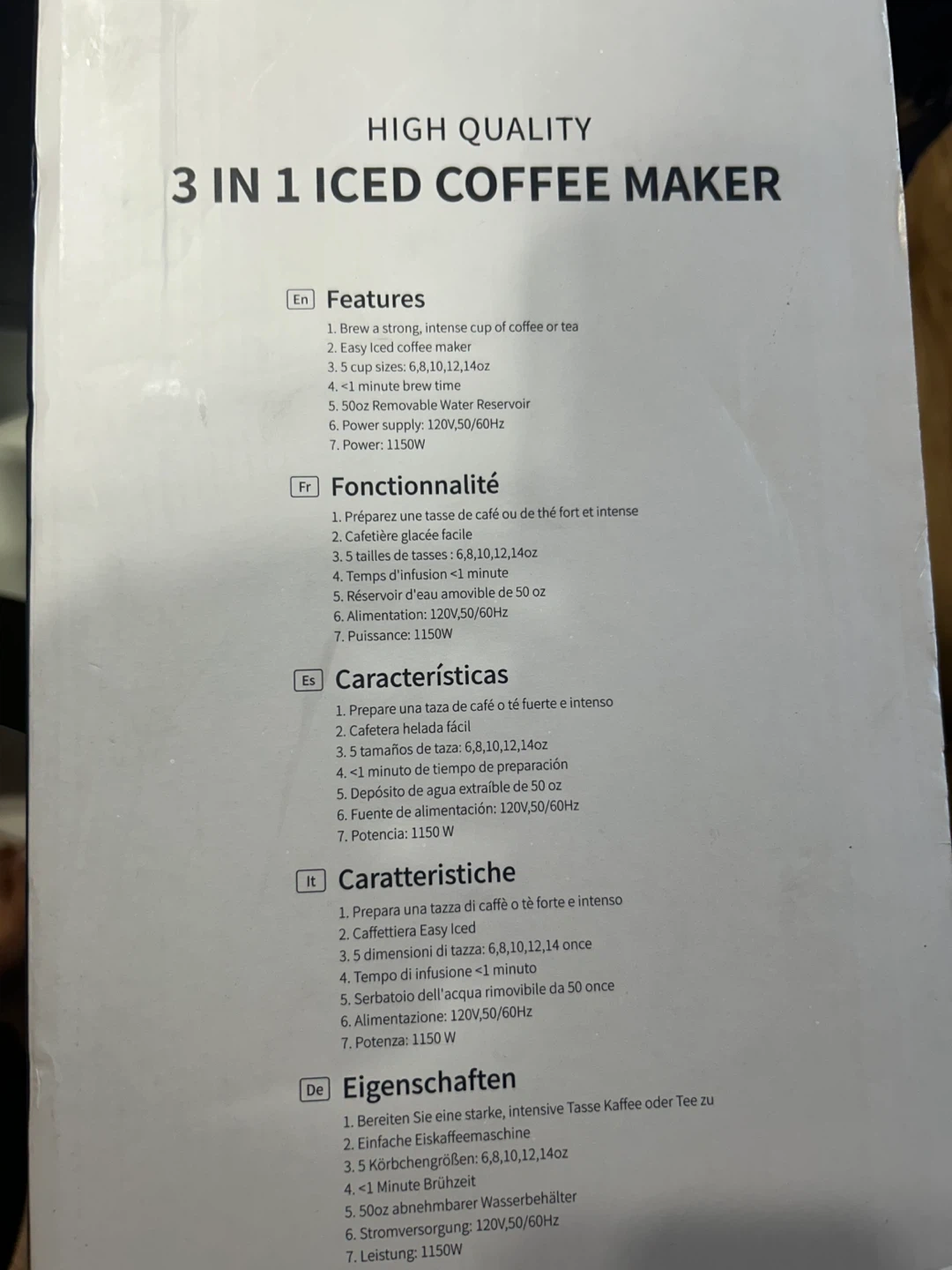 I'm selling a high-quality 3 in 1 iced coffee maker! It can brew a strong, intense cup of coffee or tea and easily make iced coffee. It features a 50oz removable water reservoir and has a power supply of 120V/50/60Hz. The power is 1150W. It comes with all the parts shown in the pictures!