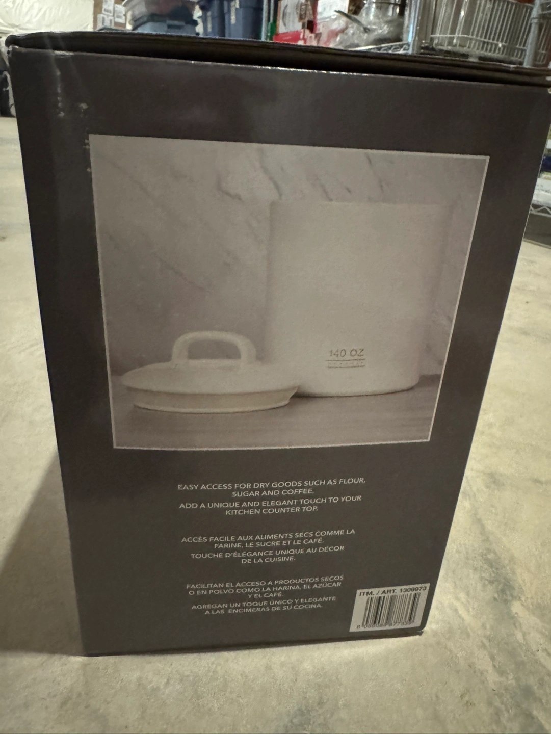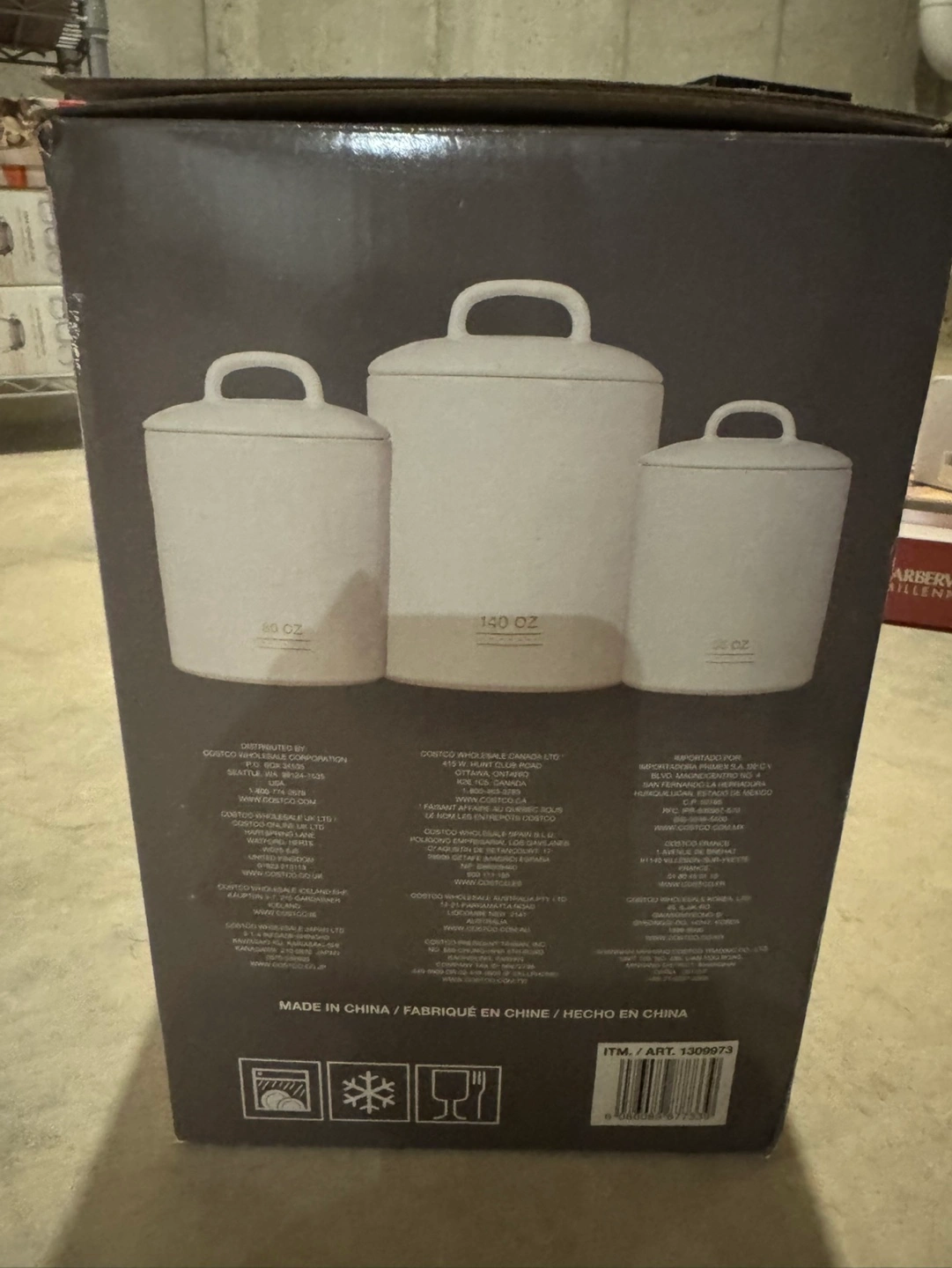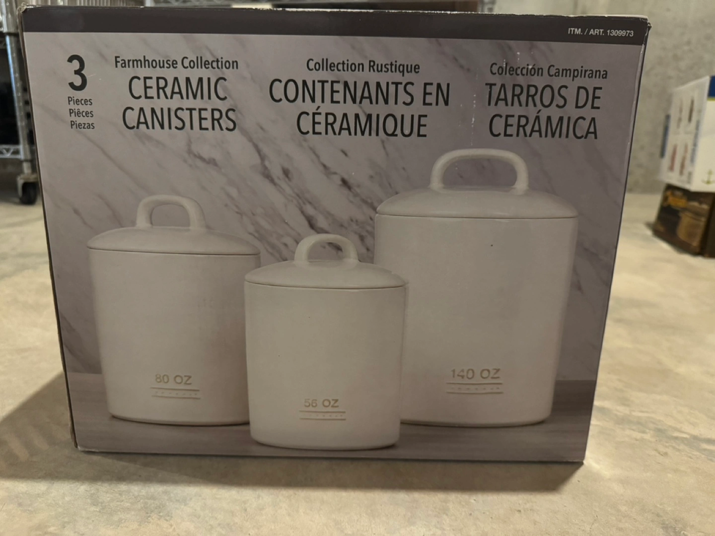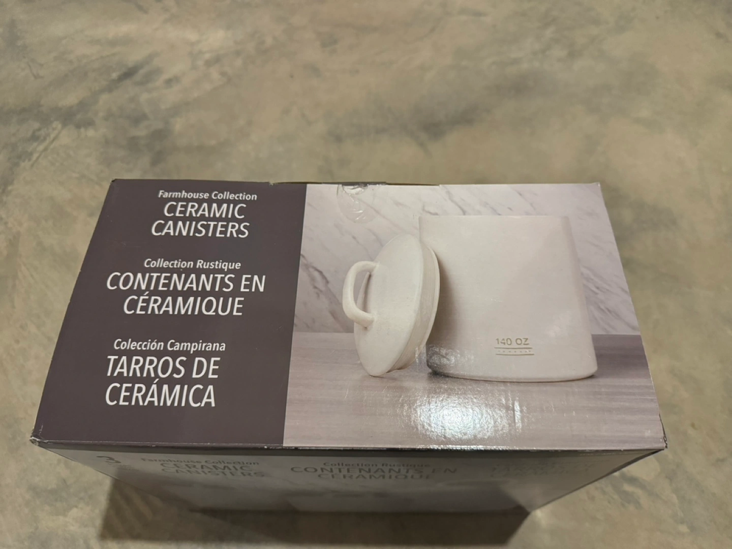 White ceramic canisters. Set of three varying sizes. Includes lids. Farmhouse style. Never been used