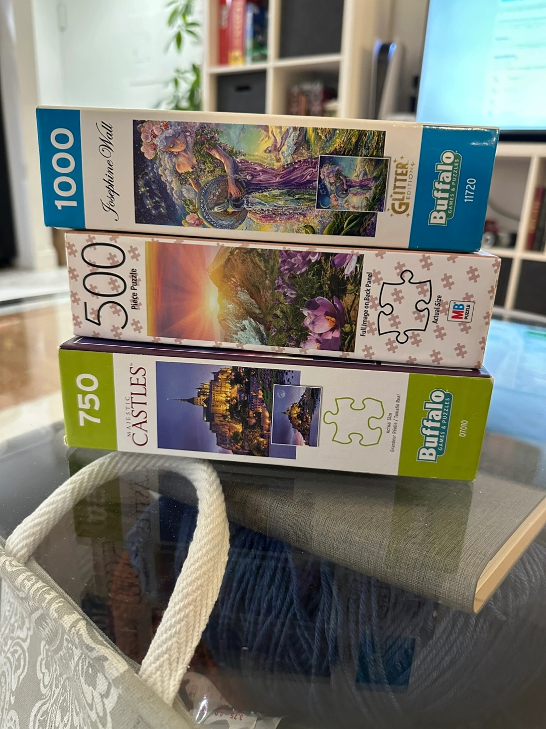 91Three different jigsaw puzzles. 750 pieces, 500 pieces, 1000 pieces. No missing pieces. Pieces in good condition.