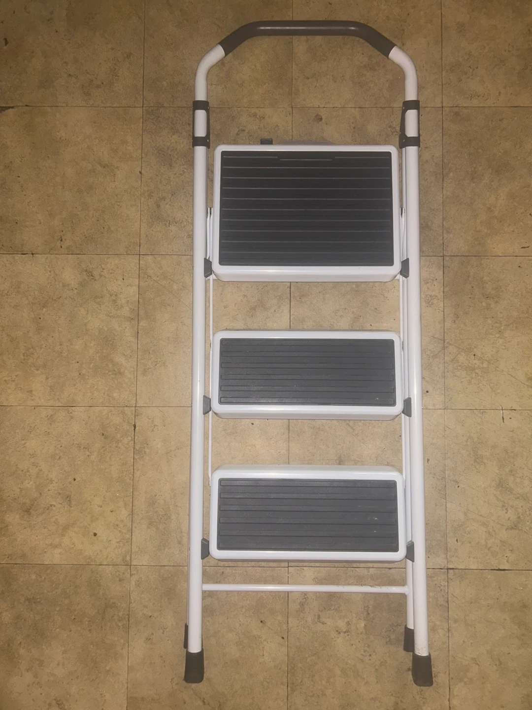 Here's a handy 3-step ladder in white! It's perfect for reaching those high shelves or doing small tasks around the house. It's in great condition and ready to help you out - top step 28” high