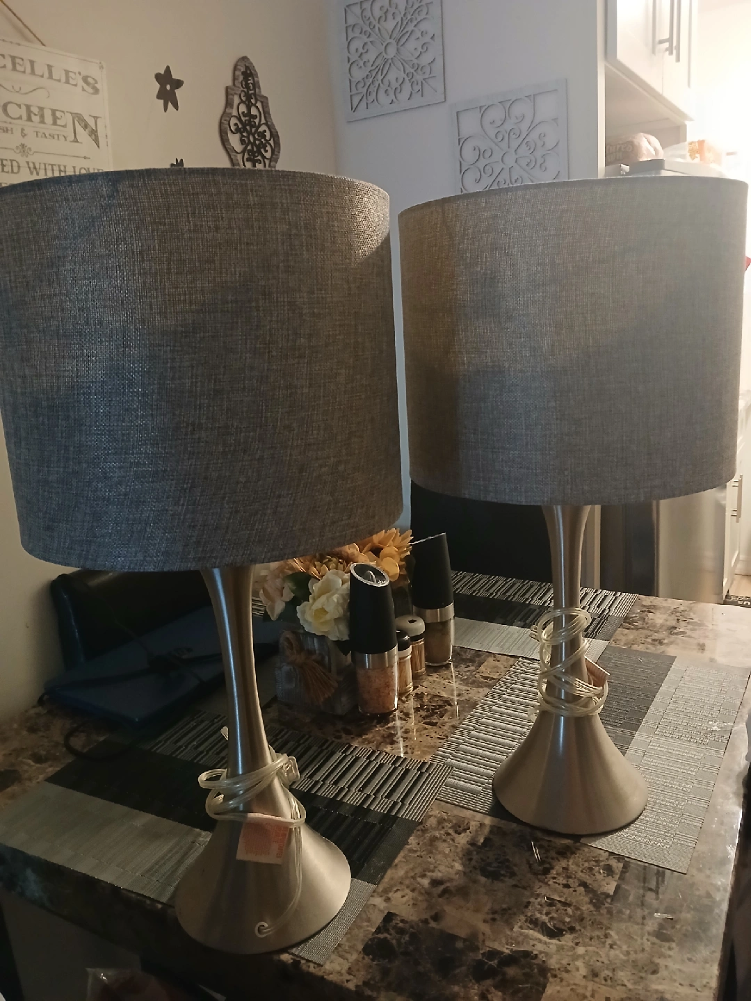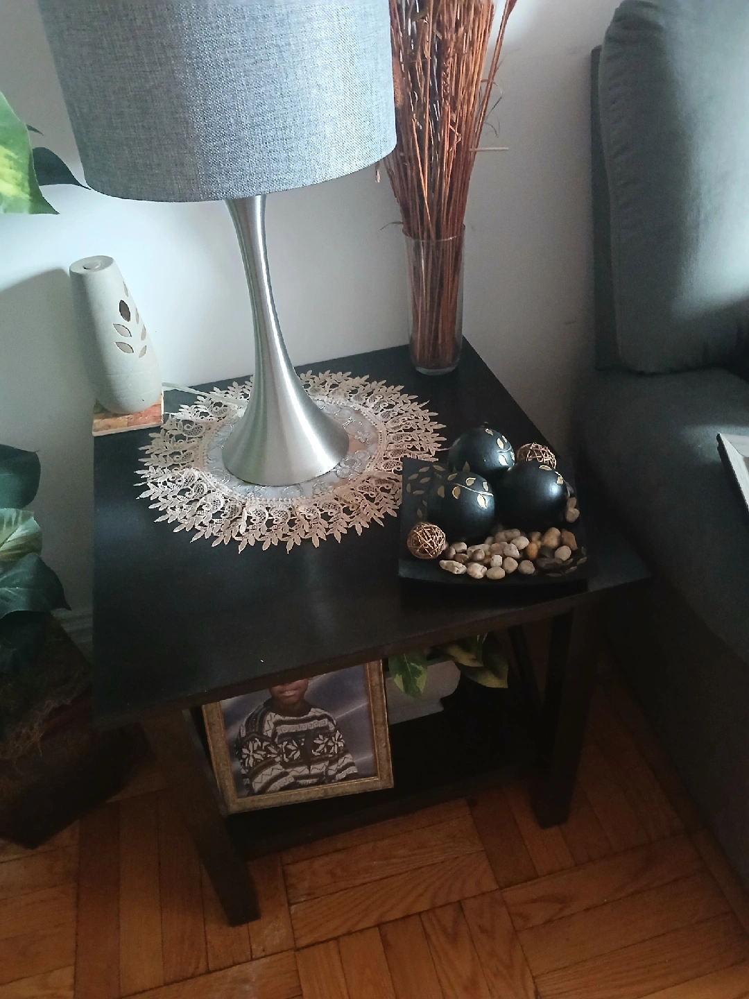 dark brown coffee table with 2 end tables and 2 matching lamps for pick up.