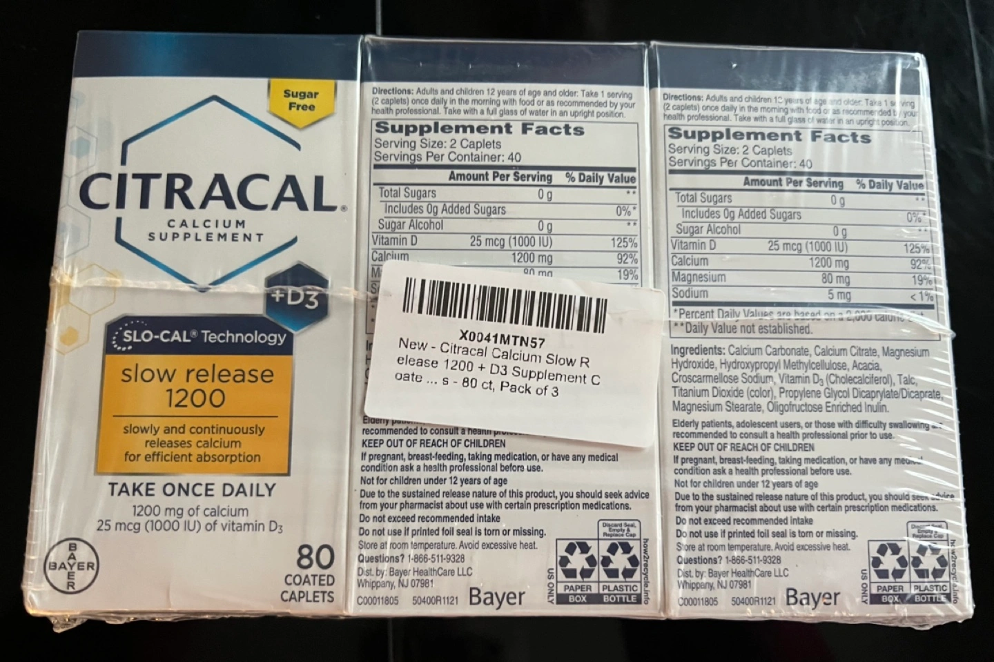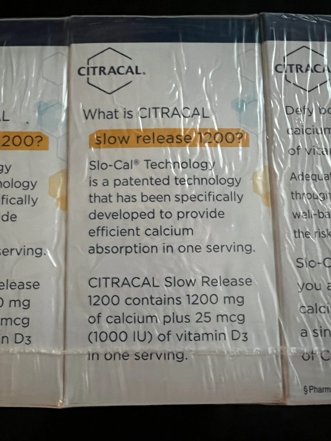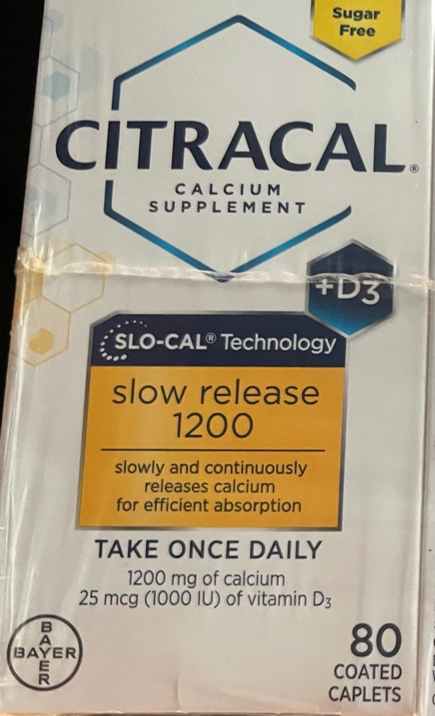 New sealed 3-box of Citracal Slow Release 1200 Calcium +D3 coated caplets. Slow release formula for efficient absorption. Contains 1200 mg of calcium and 25 mcg (1000 IU) of vitamin D3 per serving. Sugar free. Typically $18-$20 per bottle, this is $35 for 3 bottles.
