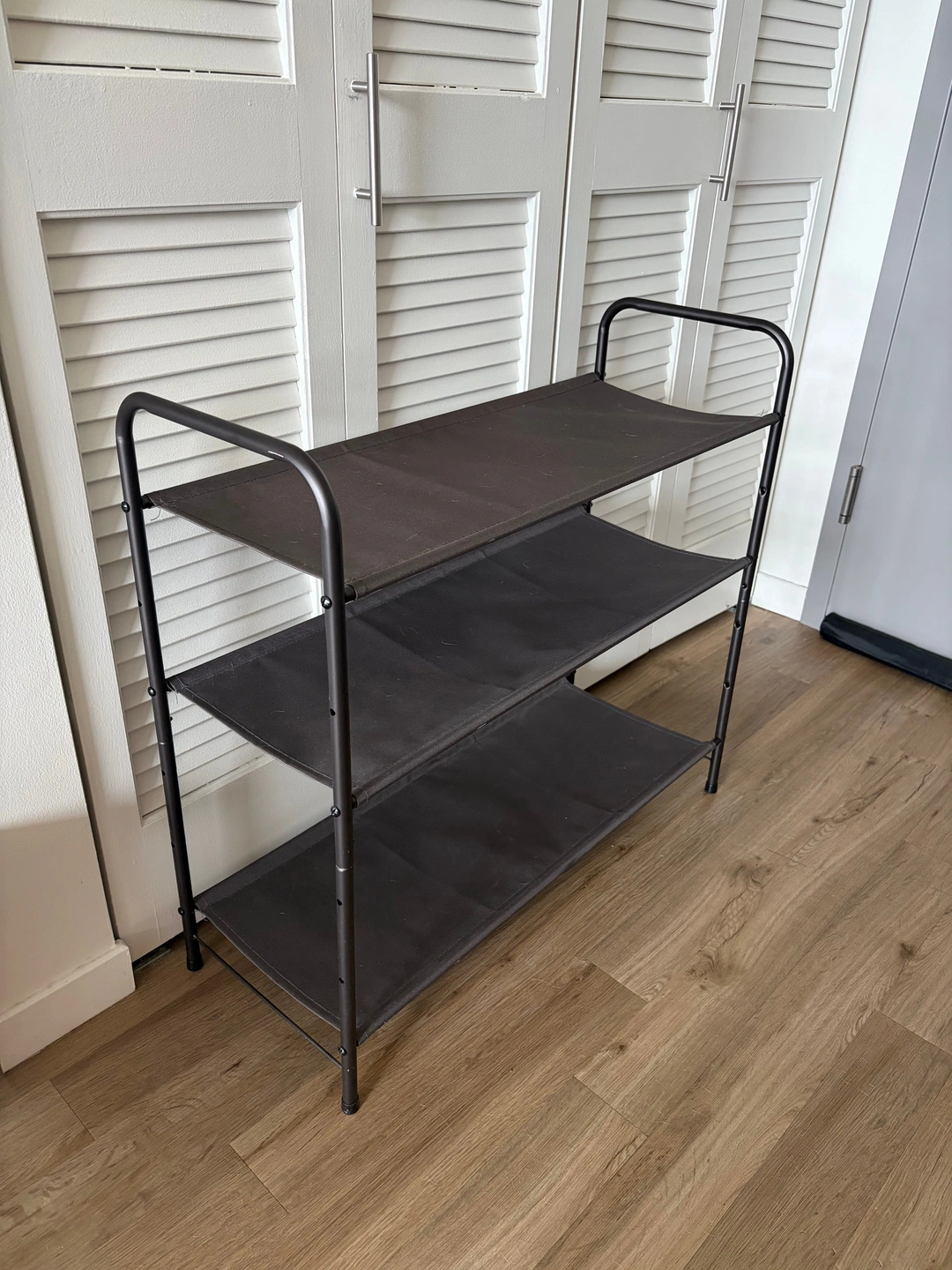 63Simple Houseware 3-Tier Shoe Rack/Organizer in bronze finish. A great space-saver for your closet, entryway, or bedroom. Sturdy metal frame with durable, washable fabric shelves. Shelves are adjustable and removable, allowing you to easily convert it to a 2-tier rack to fit taller boots. Capacity: Stores 9–16 pairs of shoes Condition: Gently used for less than 2 years. It is in excellent, clean shape. No damage, dents, or tears. Ready for immediate use. Original Price: $18. Asking $9 OBO (Or Best Offer). Pickup: Local pickup only in Lake View East / Wrigleyville. Payment: Cash or Venmo.