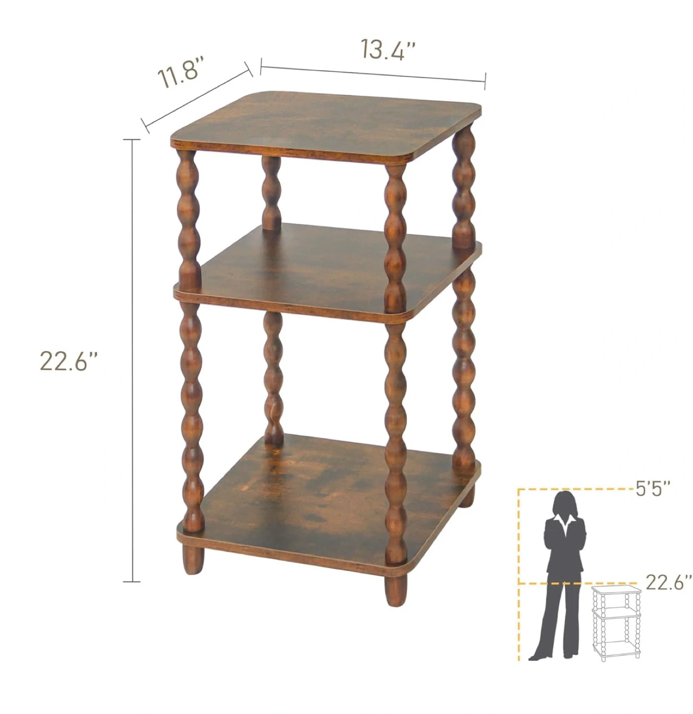 106I'm selling a charming 3-tier side table, perfect for adding a touch of elegance to any room! It features a beautiful brown wood finish and a unique design with decorative spindle legs. Key features: - Compact design, ideal for small spaces - Dimensions: 11.8" x 13.4" x 22.6" height