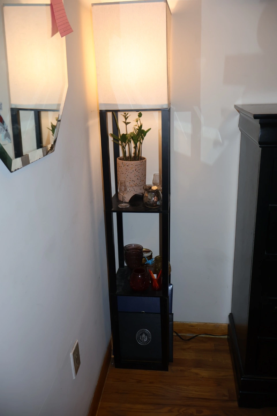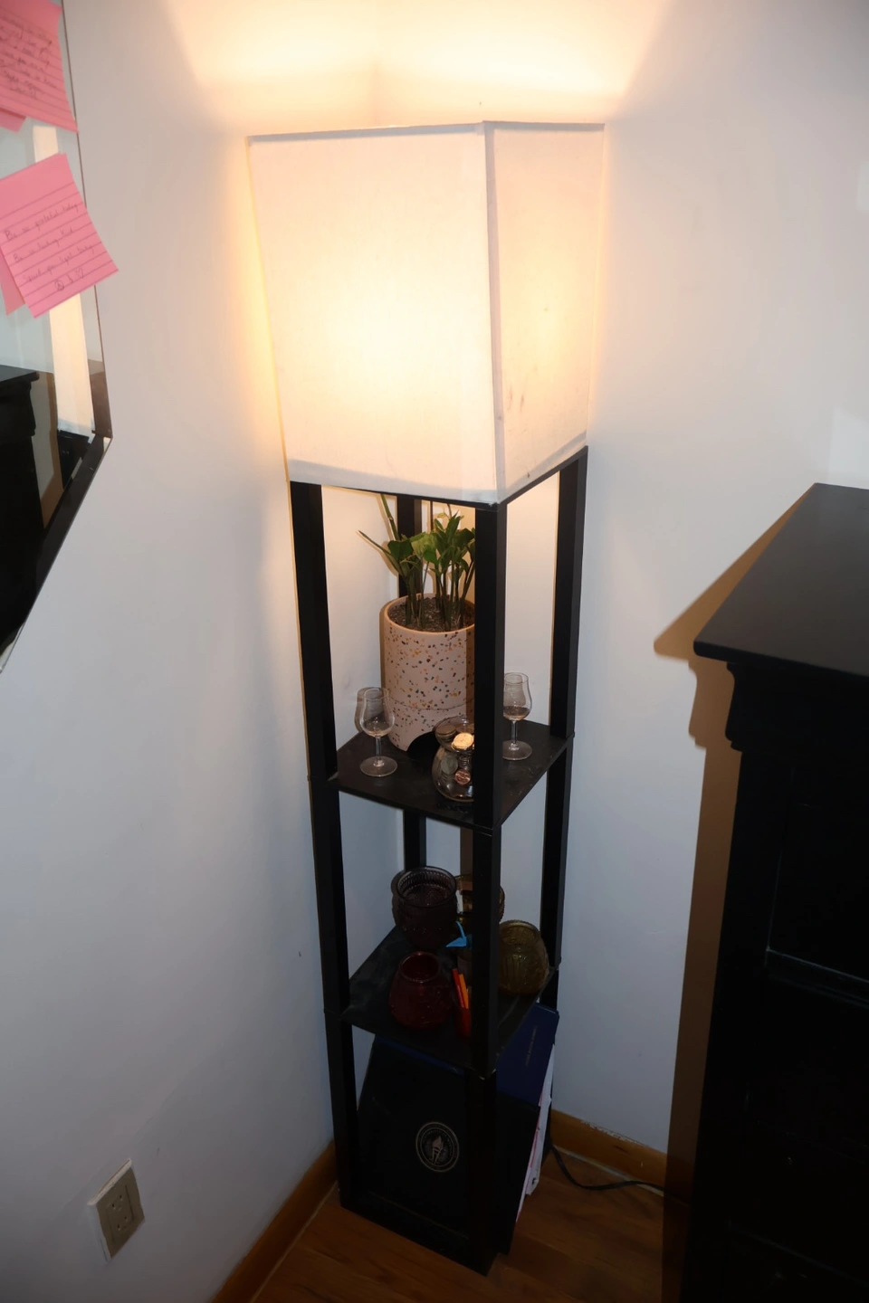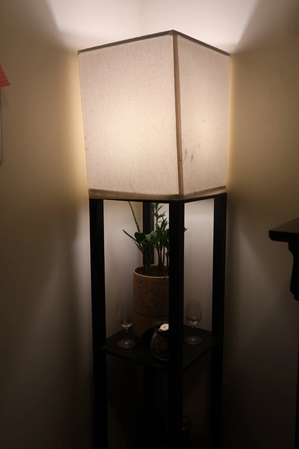 A wooden body in black with a cream colored shade. It two shelves for knick-knacks, books, plants, etc. It provided me with very warm, cozy lighting in my bedroom for the last 4 years. It’s in great condition just doesn’t have a spot in my new apartment. Would love to pass her along to light up someone else’s life. Very lightweight for transport.
