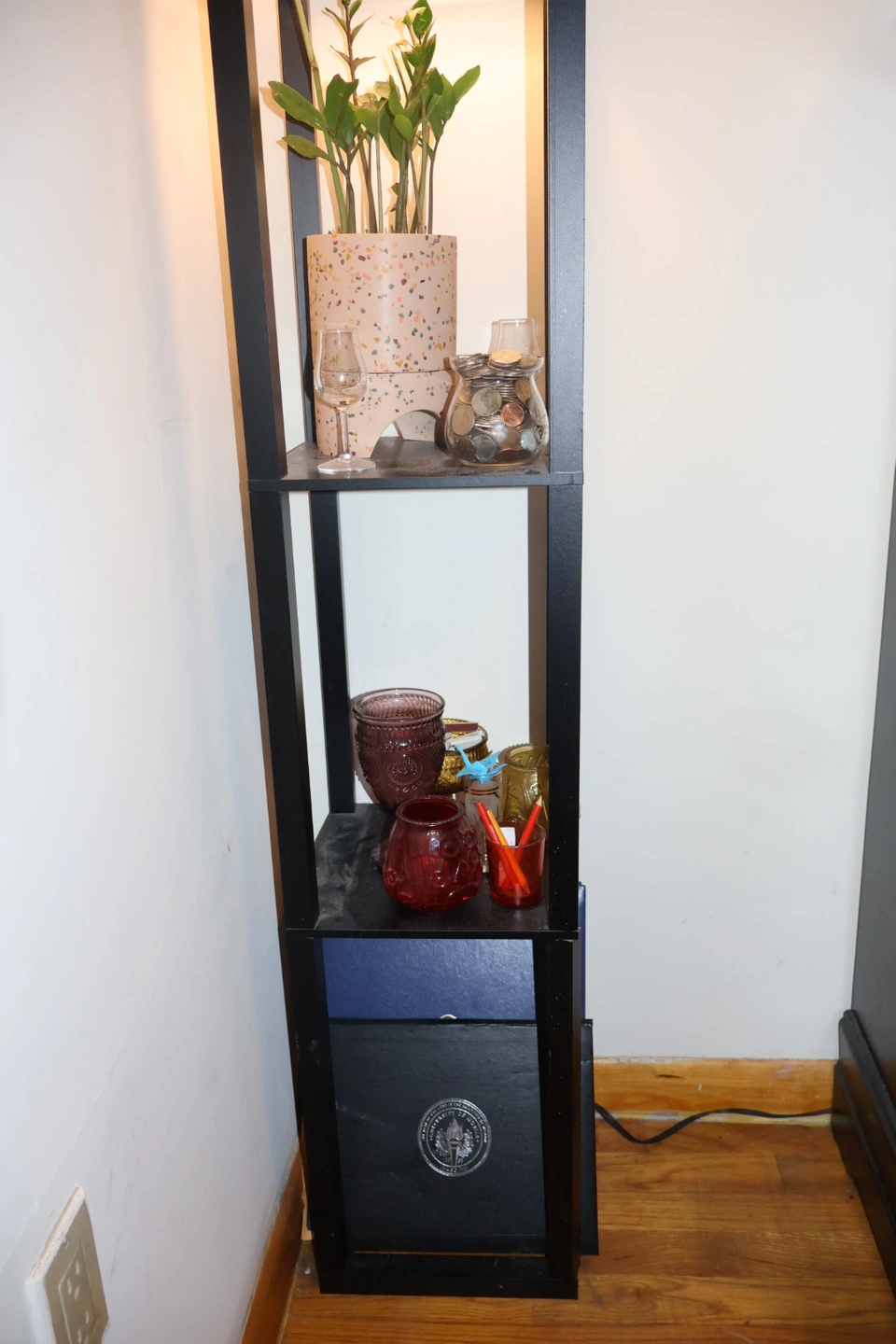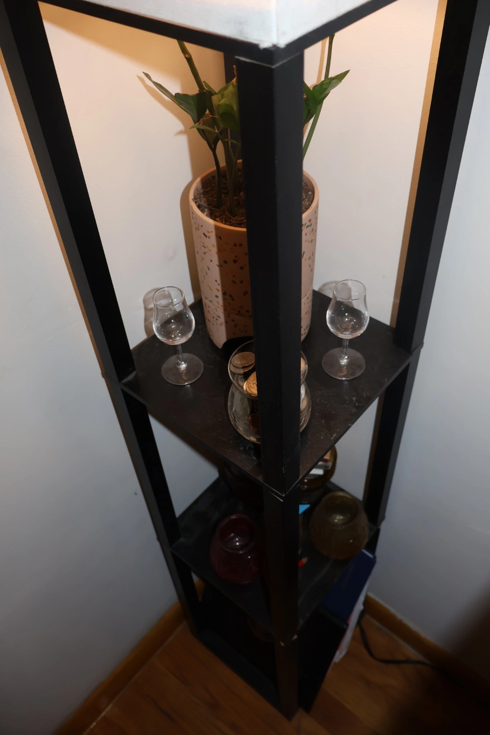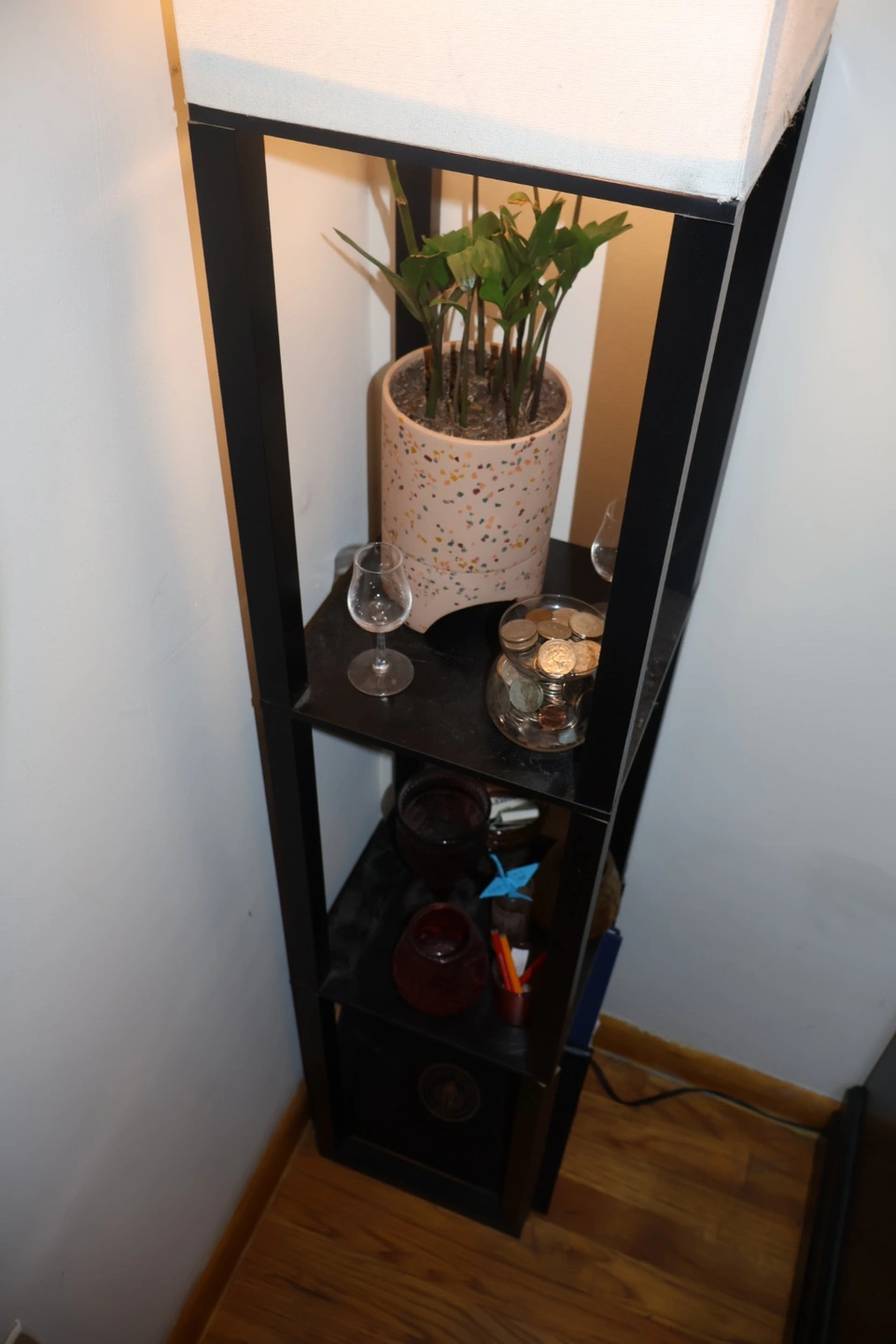 A wooden body in black with a cream colored shade. It two shelves for knick-knacks, books, plants, etc. It provided me with very warm, cozy lighting in my bedroom for the last 4 years. It’s in great condition just doesn’t have a spot in my new apartment. Would love to pass her along to light up someone else’s life. Very lightweight for transport.