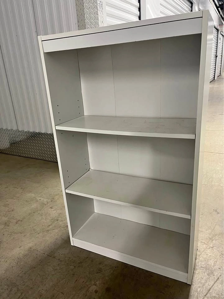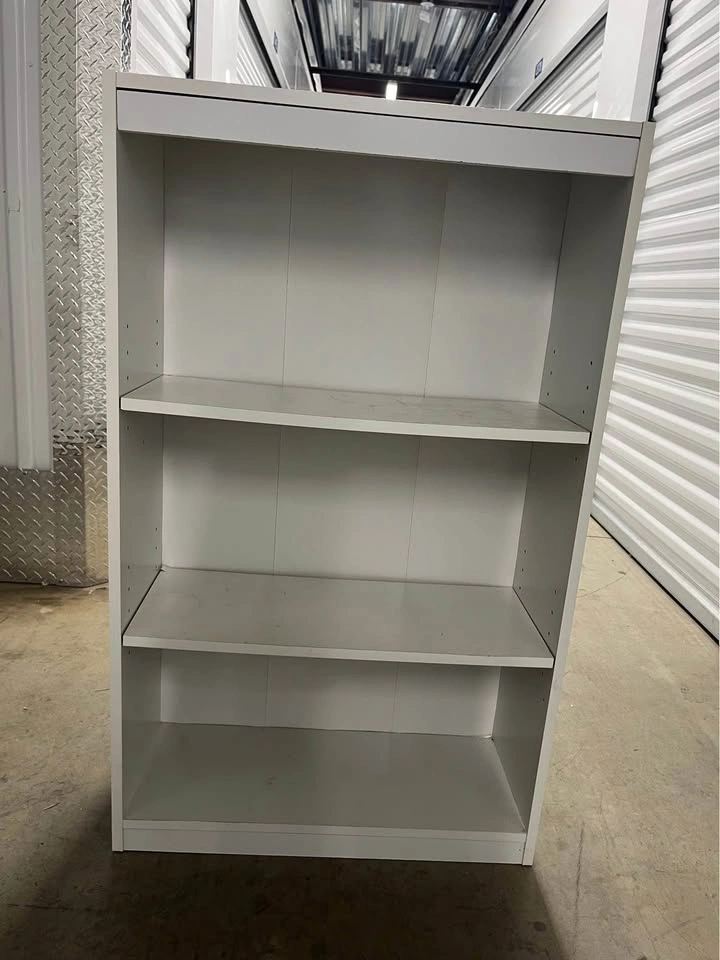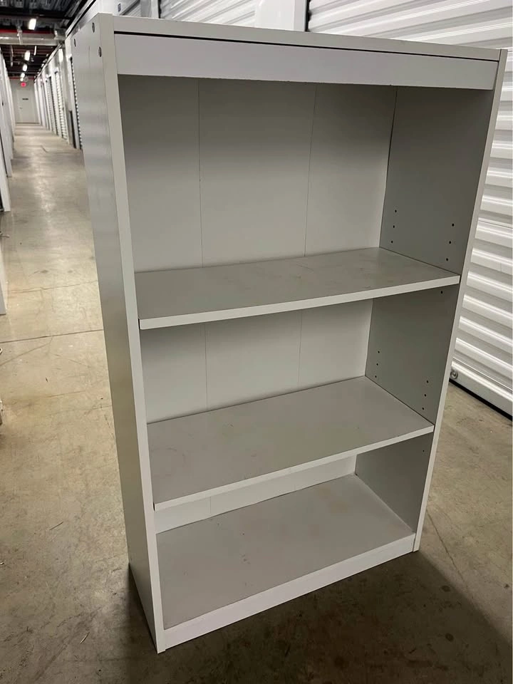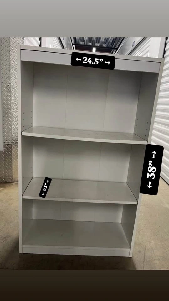 White 3 tier shelving that can be used for books or even to add to pantry. Shelves are adjustable. Shelf is assembled so please be prepared for transporting item.