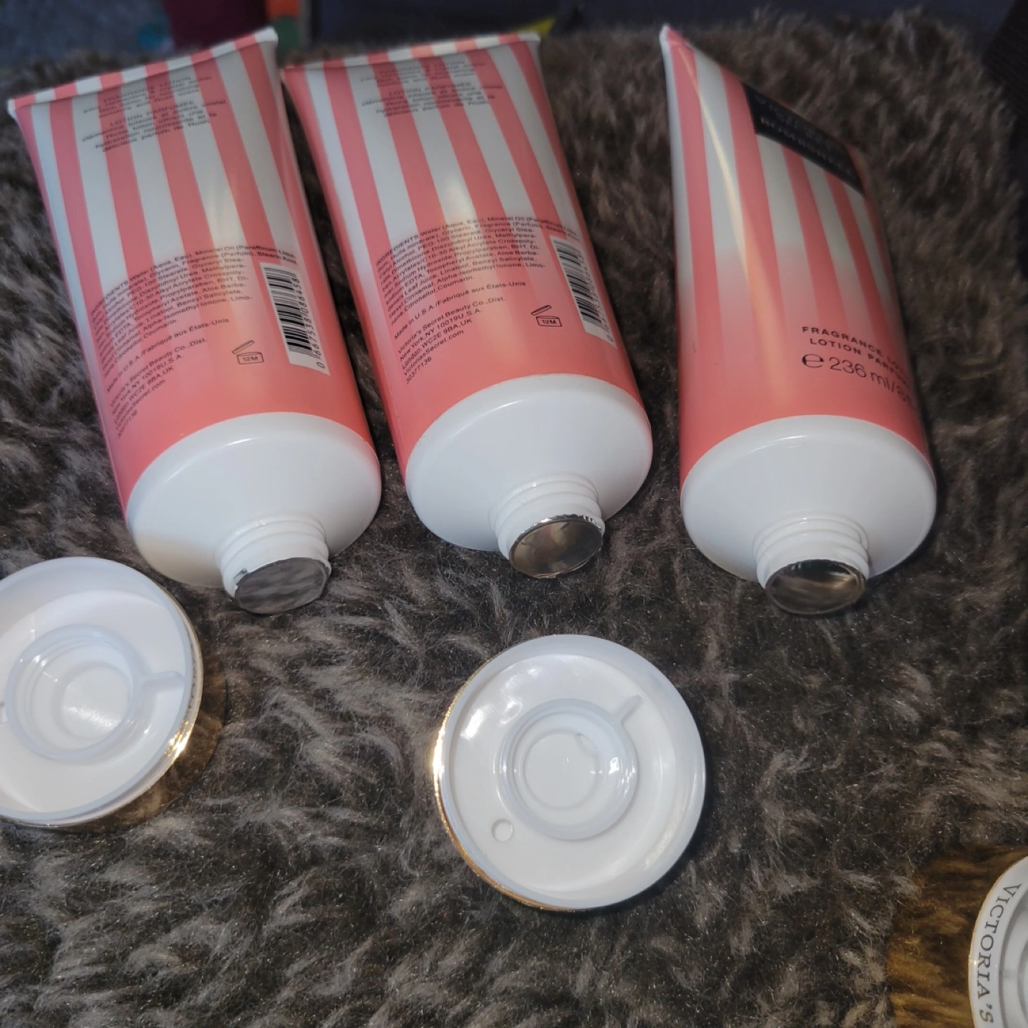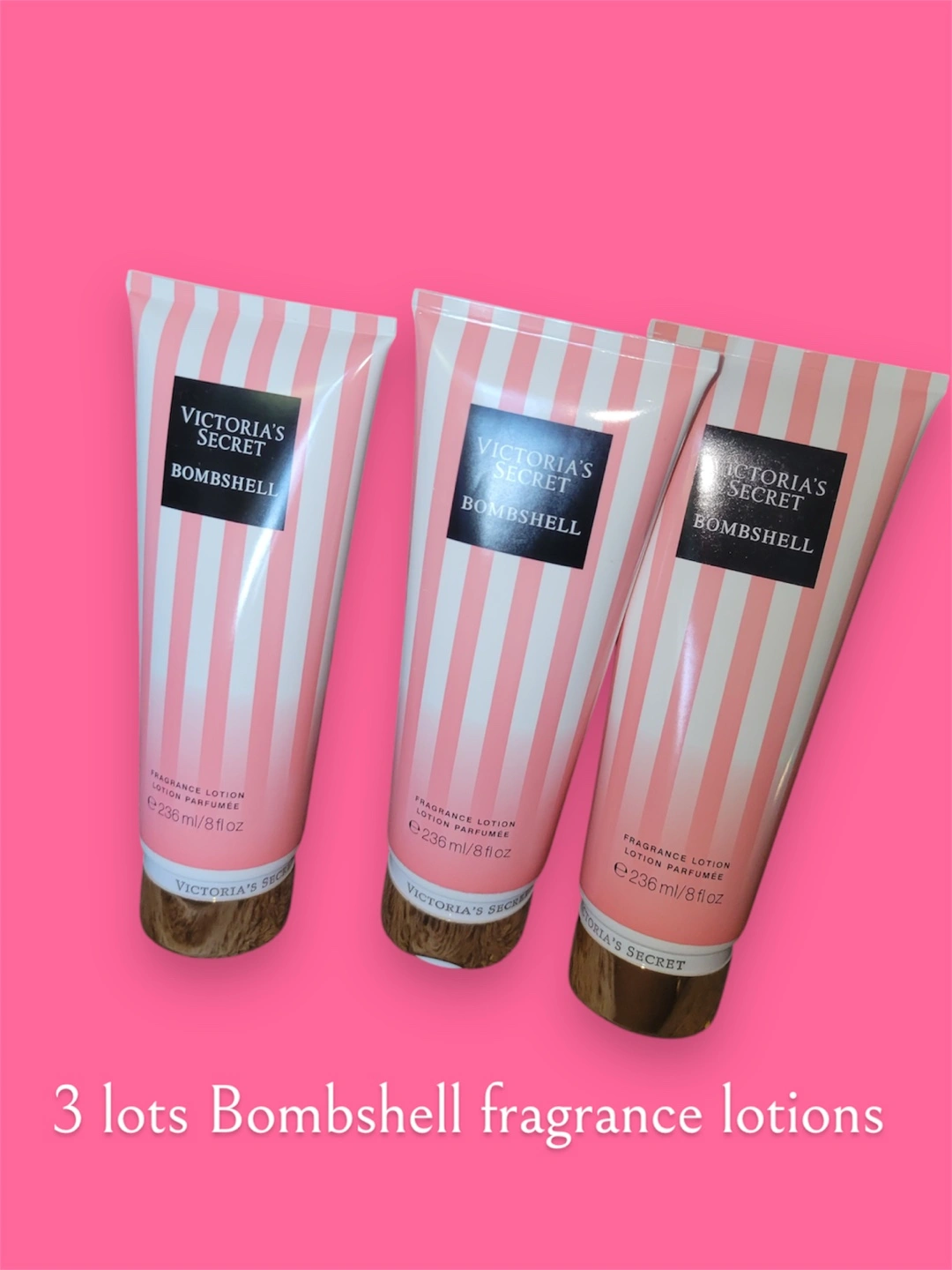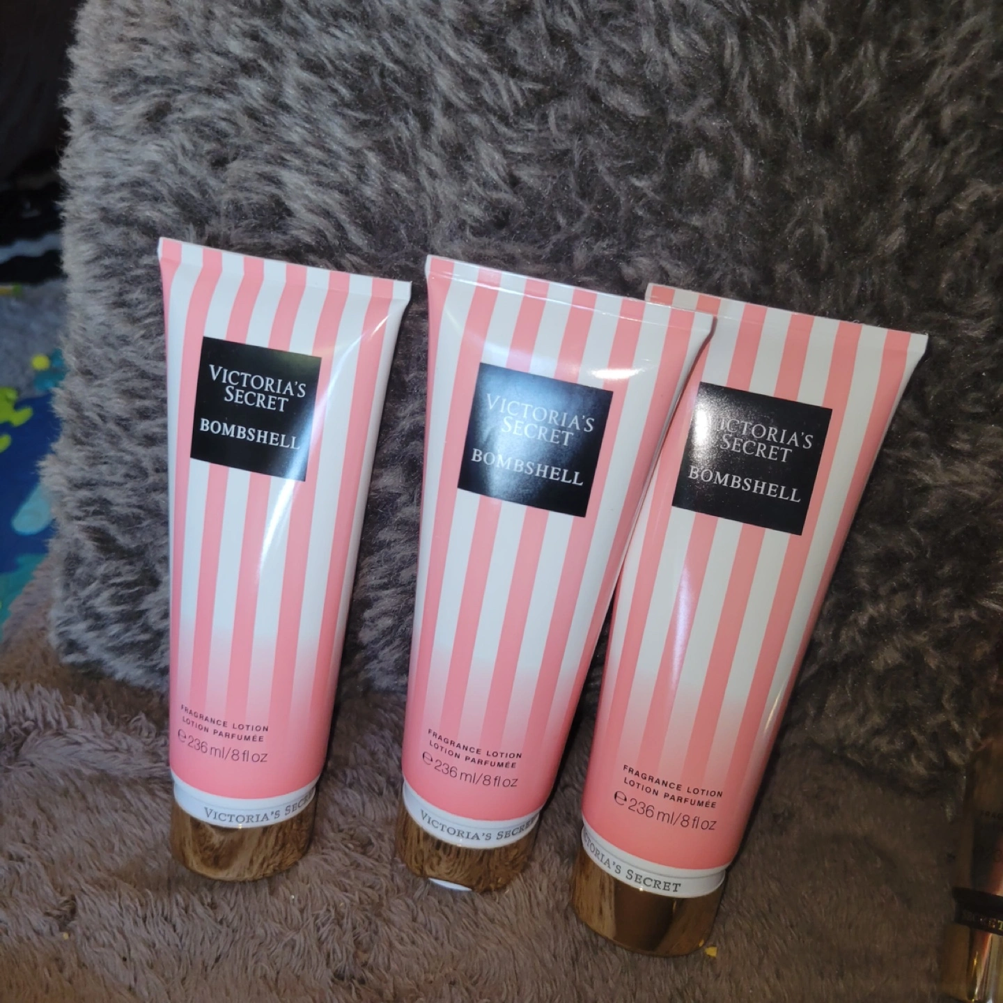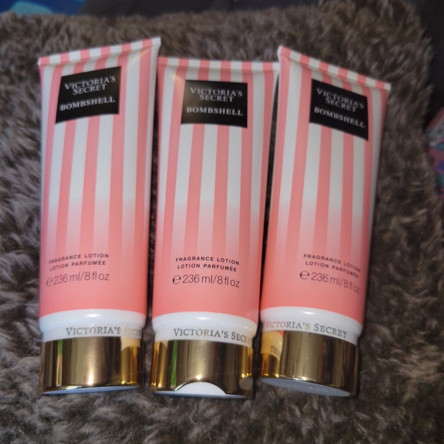 Three tubes of Victoria's Secret Bombshell fragrance lotion. Each tube is 8 fl oz/236 ml. New, unopened.