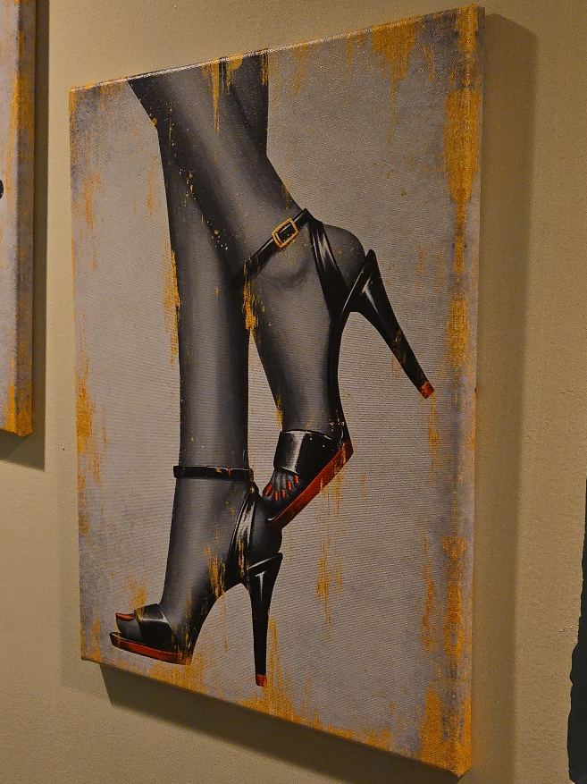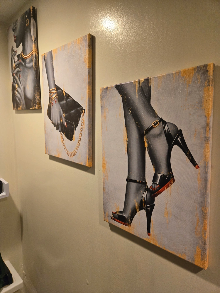 3 decorative and stylish wall art canvas prints featuring a pair of high heels, purse, and perfume. It would look great in any room! I have it in my bathroom.