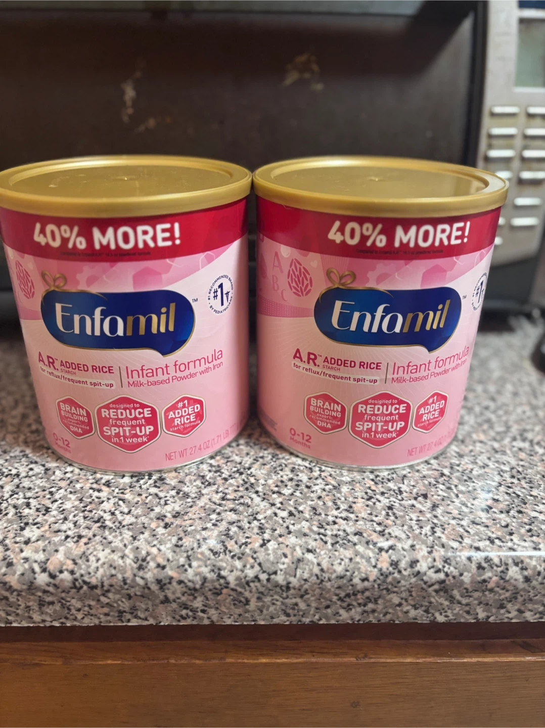Selling two cans of Enfamil A.R. Added Rice Infant Formula designed to reduce frequent spit-up in 1 week! Each can contains 27.4 oz of milk-based powder with iron. Recommended for babies 0-12 months. Expires November 2026