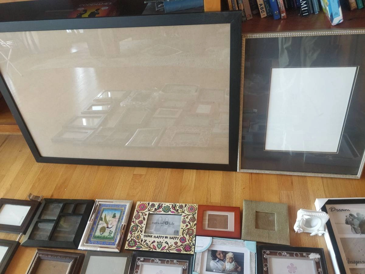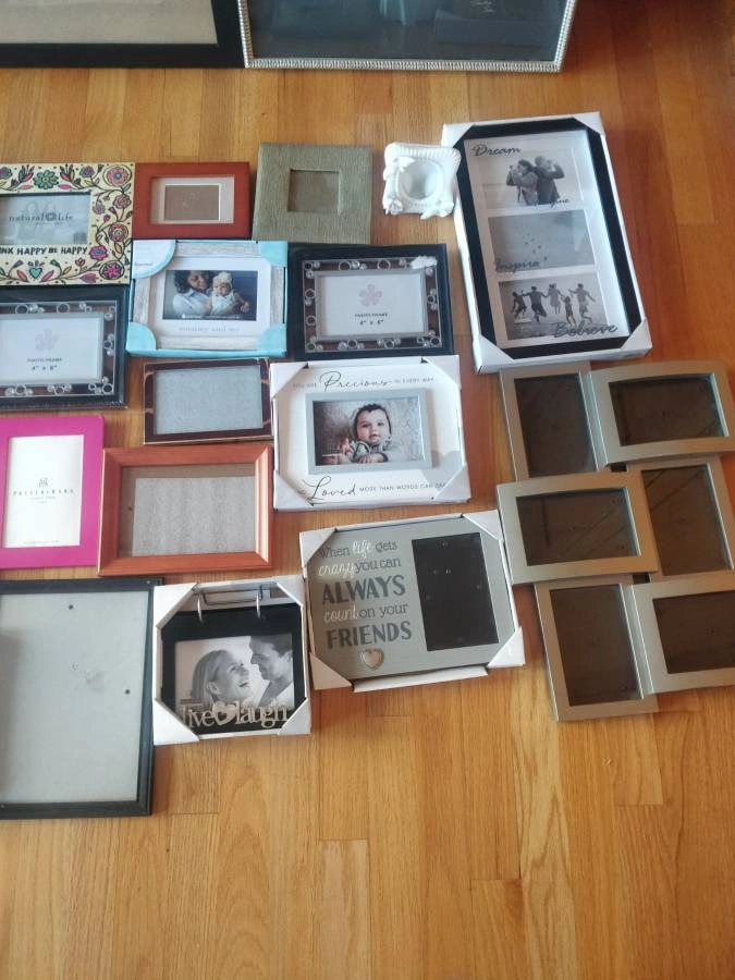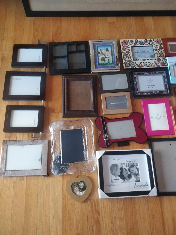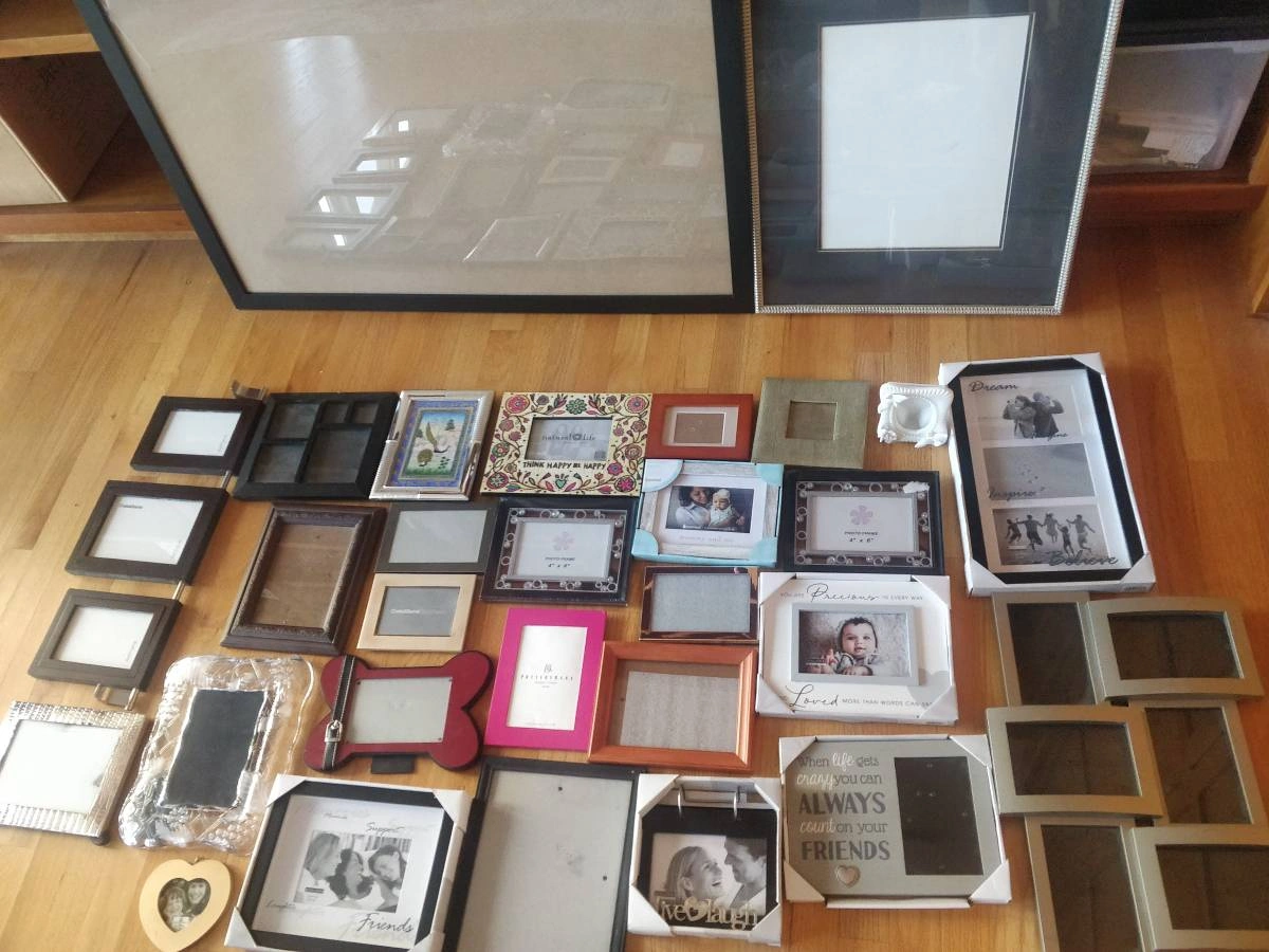 Photo frames of various sizes and shapes Many of them are brand new Frame size - Wallet size, 4"x6", 5"x7", 8"x10", 19"x 23" picture, three panel photo room divider screen (holds 15 pictures), poster frames Includes silver plated frames, photo album frame, Multi-picture frames, crate and barrel frames, wood photo frames, poster frame and many more beautiful photo frames Also includes hand painted art on fabric in a silver plated frame home decor, staging, family, friends, pictures, photos, memories, moms, baby, pet frame Crate and Barrel, Pottery Barn, silver plated, wood carved, multi picture frames