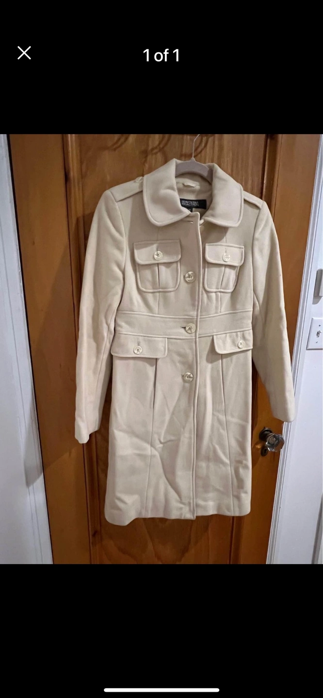Cream-colored women's coat. Has four front pockets and buttons down the front.