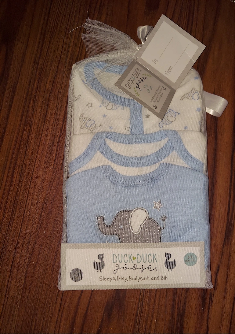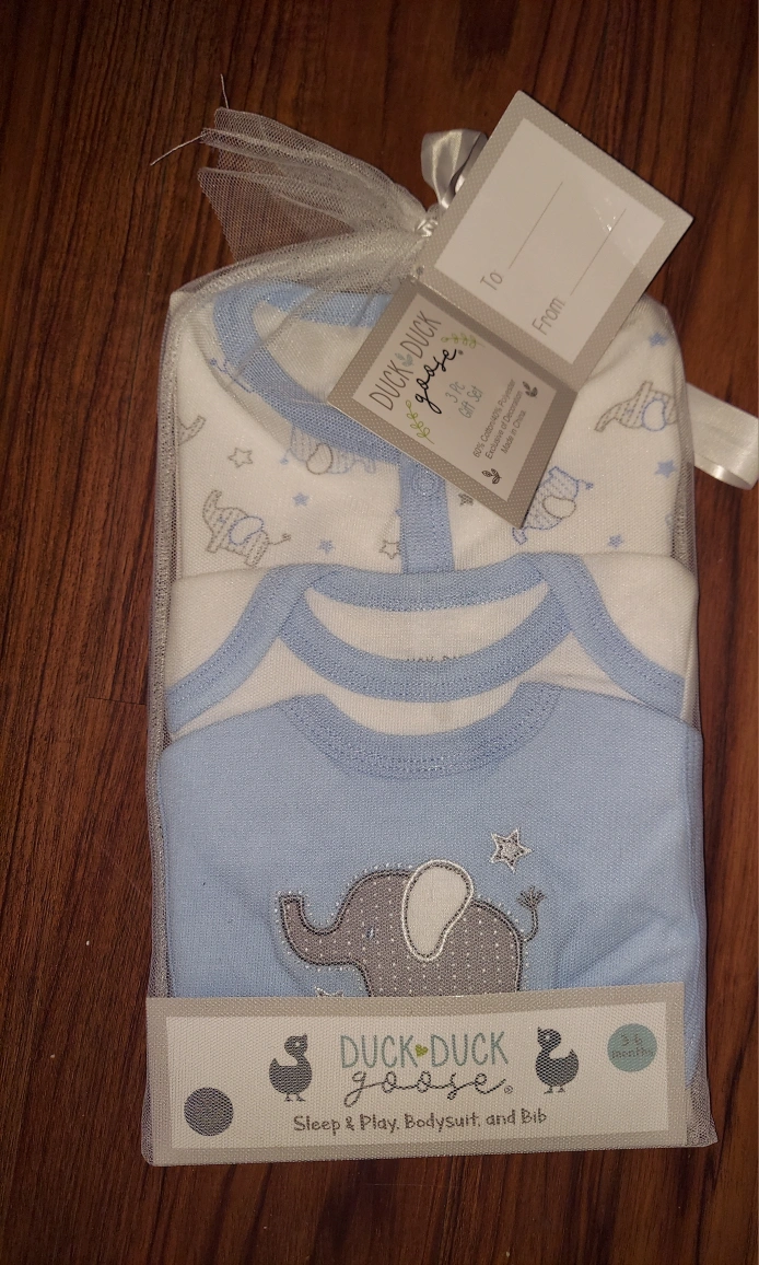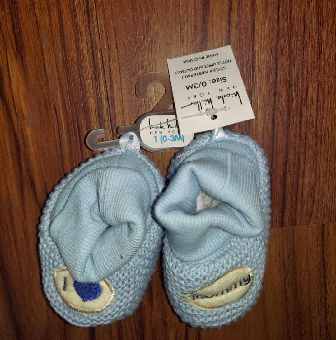 18New with tags, size 3-6 months, blue and gray elephant design.Blue knitted baby booties with "I Love Mommy" on them. Size 0-3M..