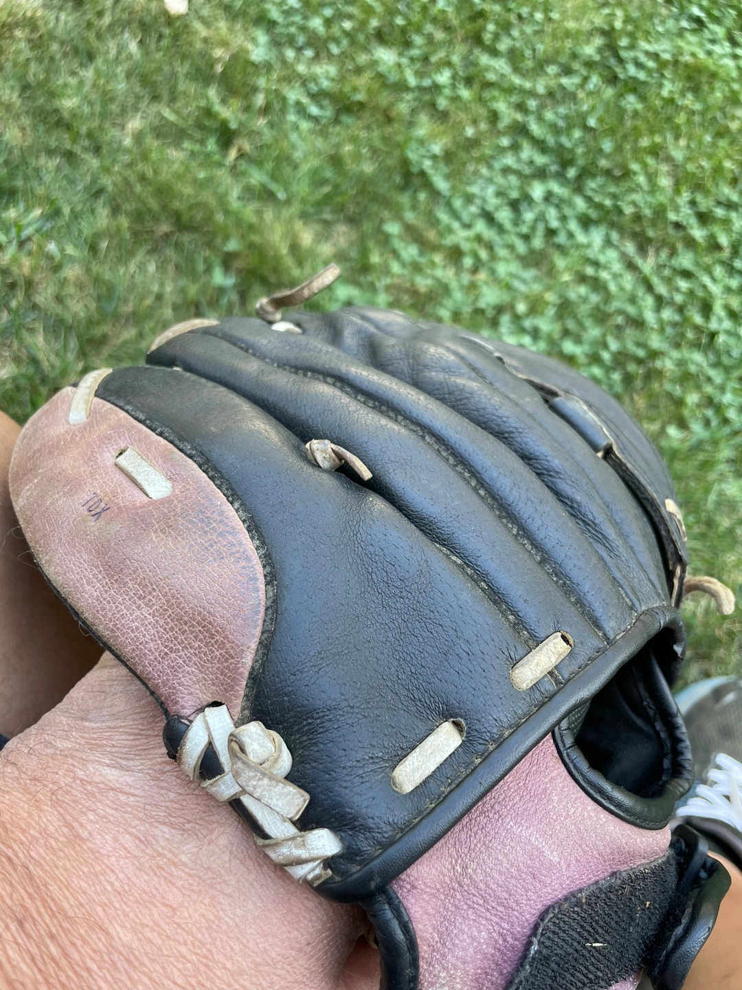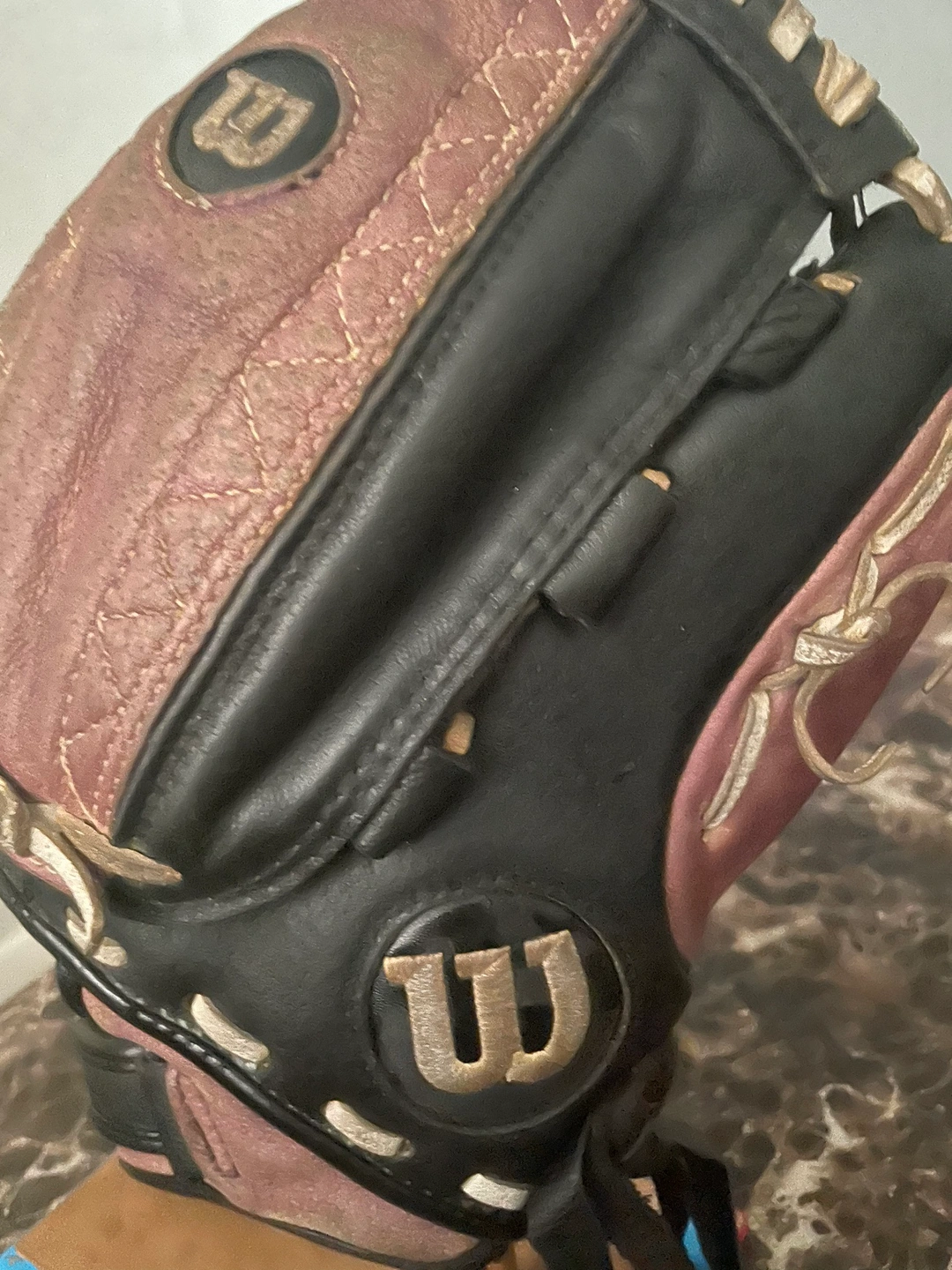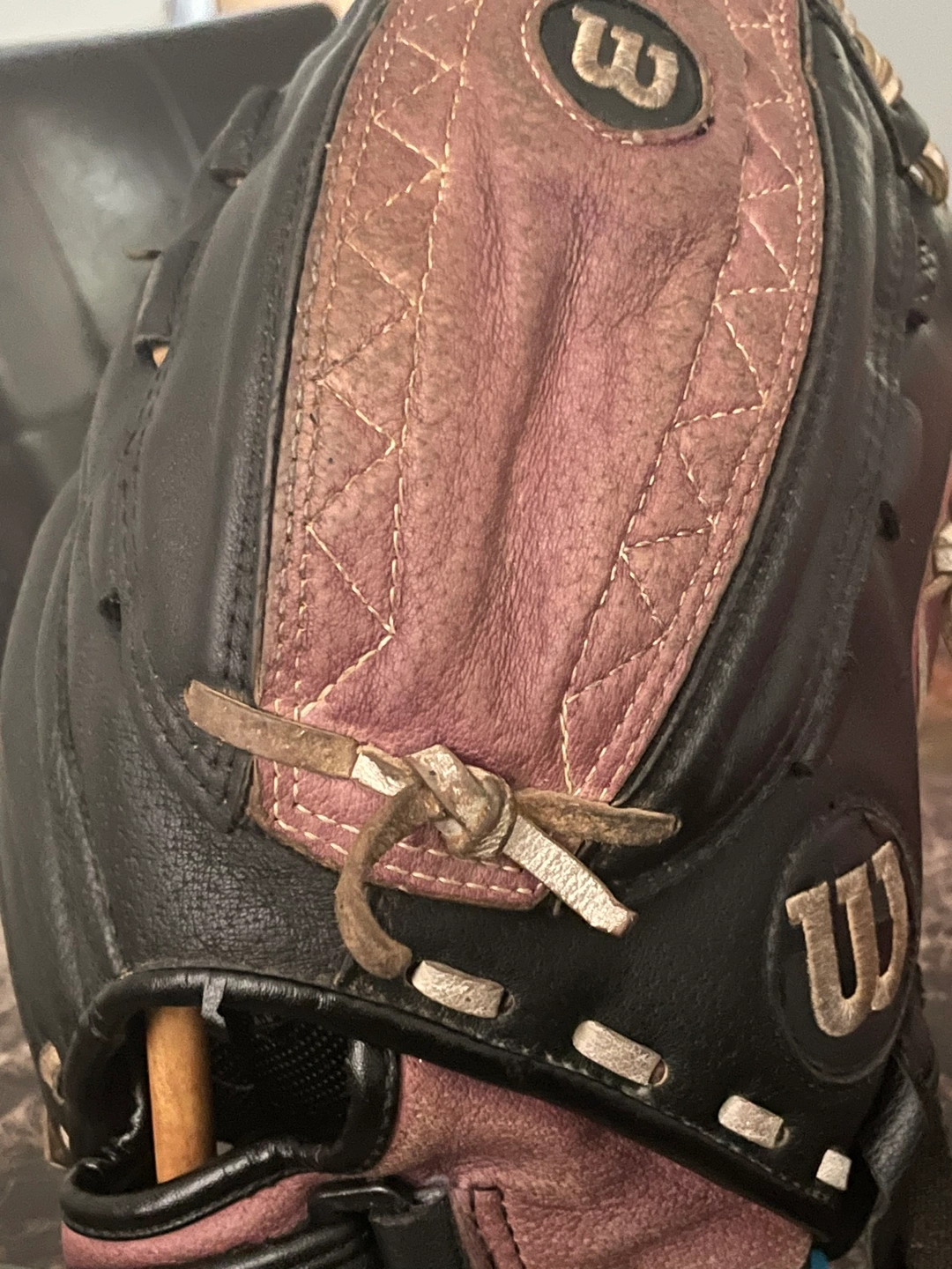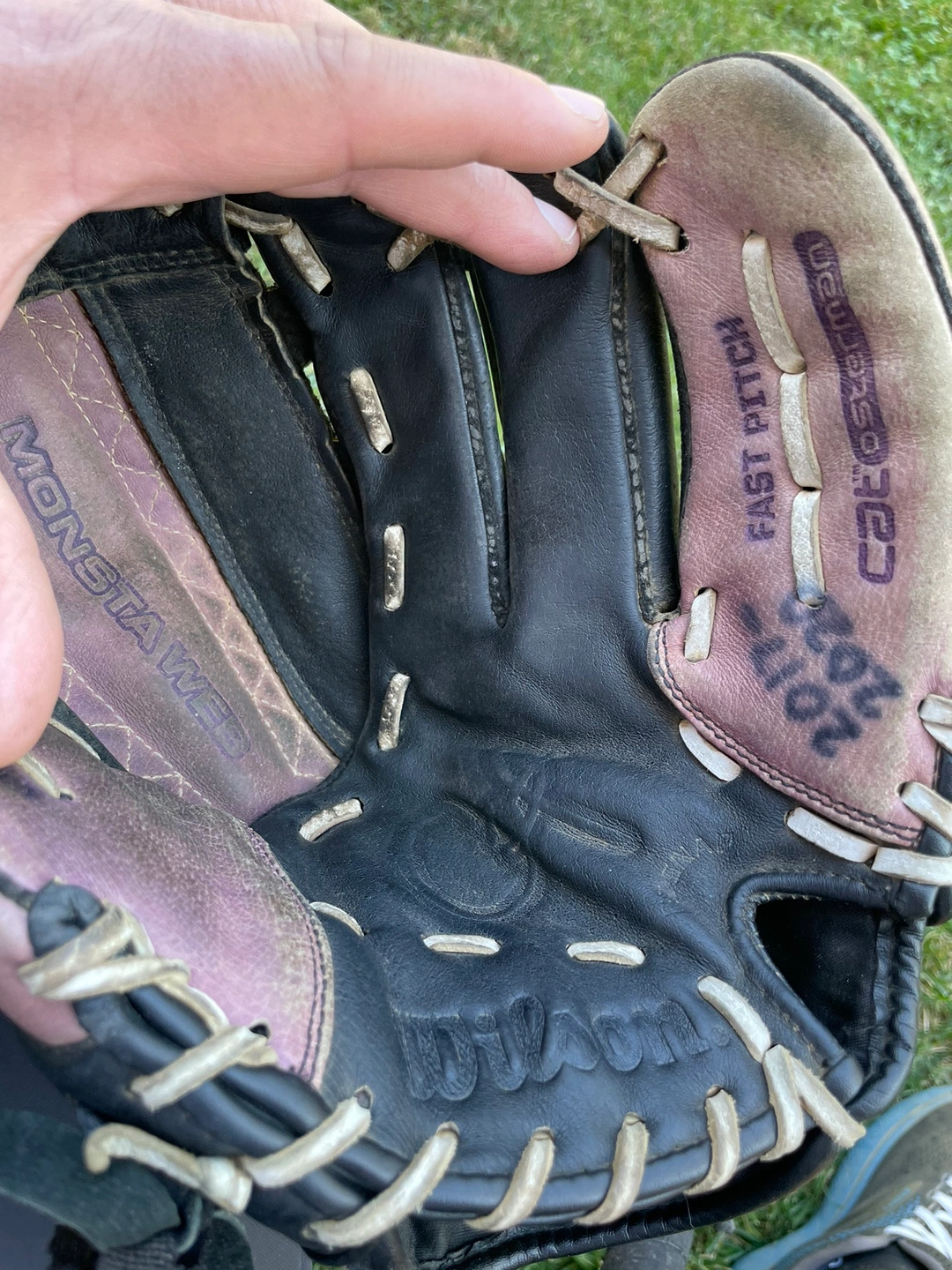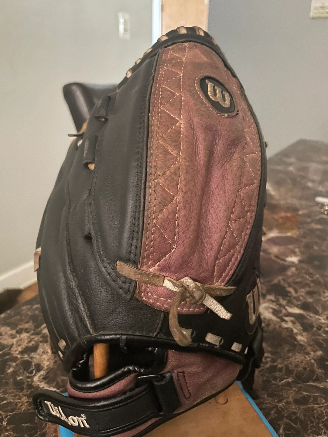 154Used softball glove in black and purple. It is a right-handed glove. The glove is broken in and ready to use. It comes with a wrist strap.