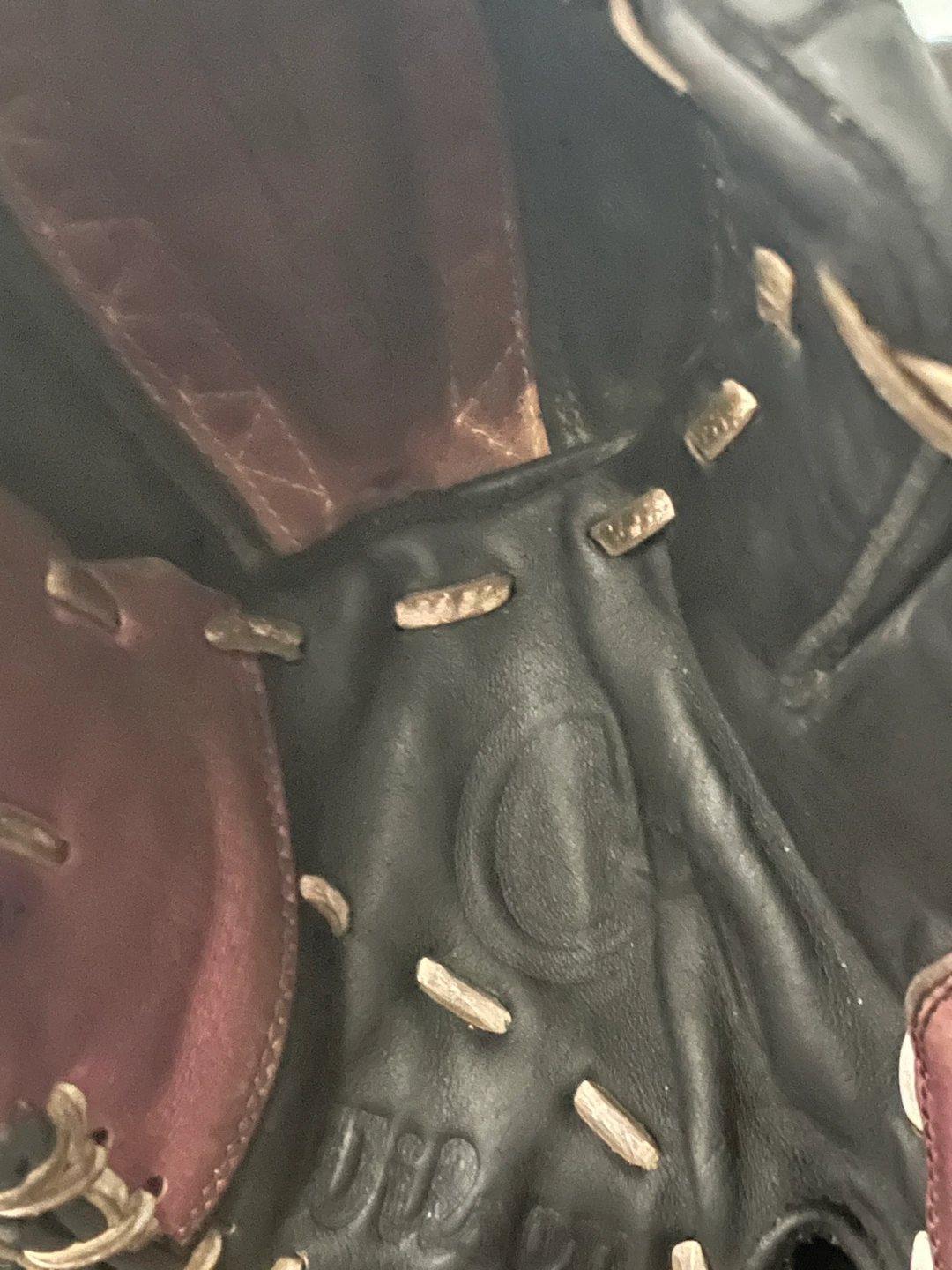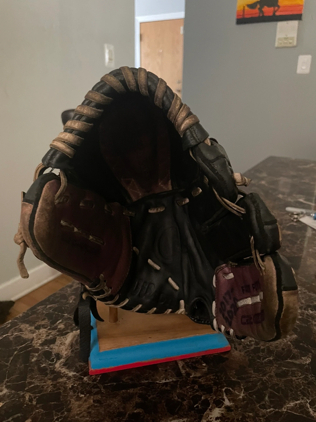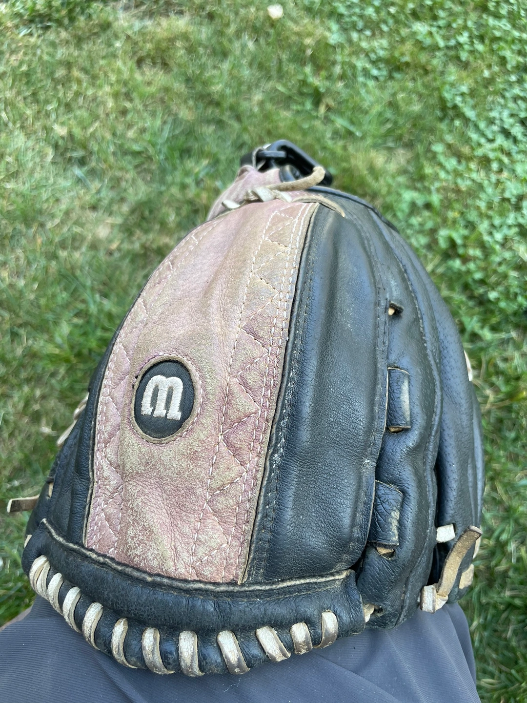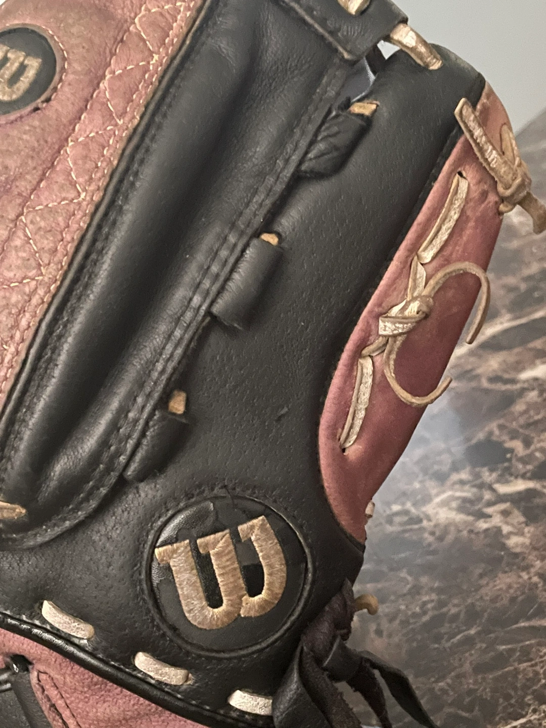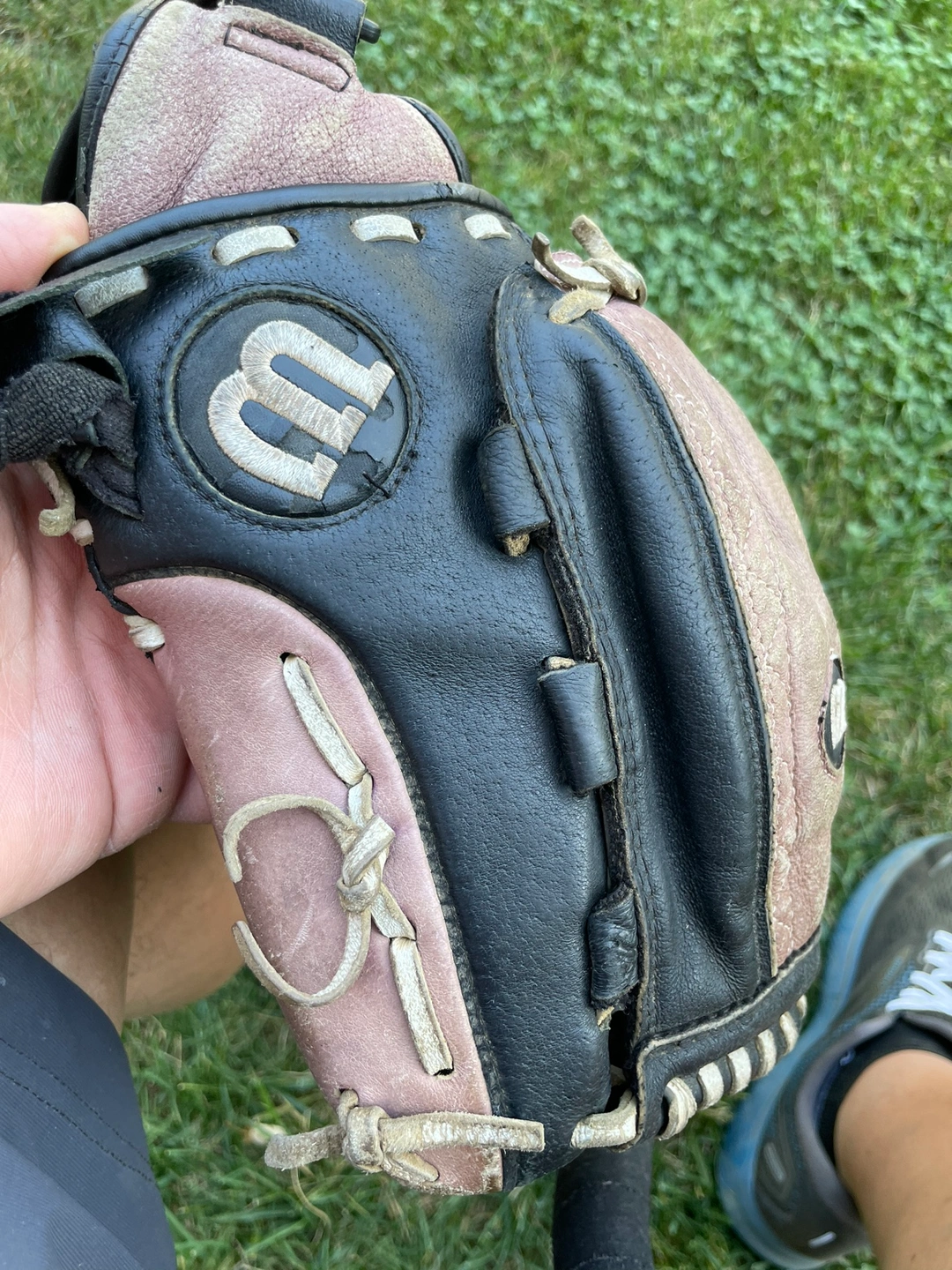 154Used softball glove in black and purple. It is a right-handed glove. The glove is broken in and ready to use. It comes with a wrist strap.