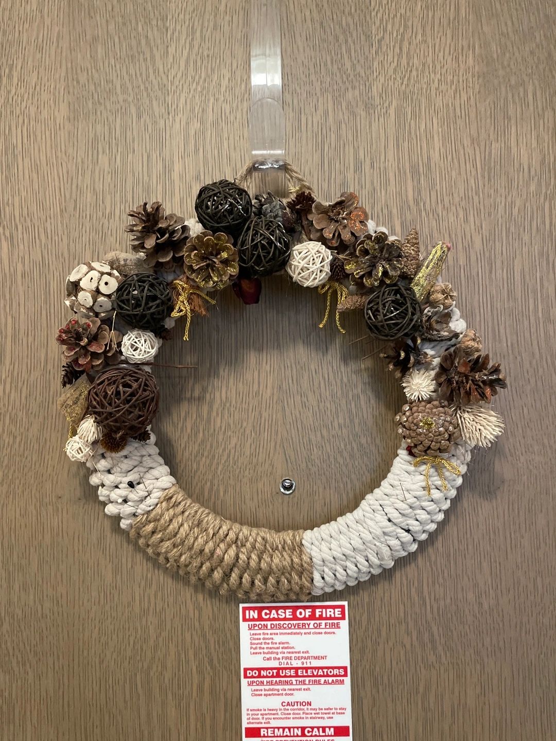 A handmade wreath with a rope base and various pine cones and other natural decorations.