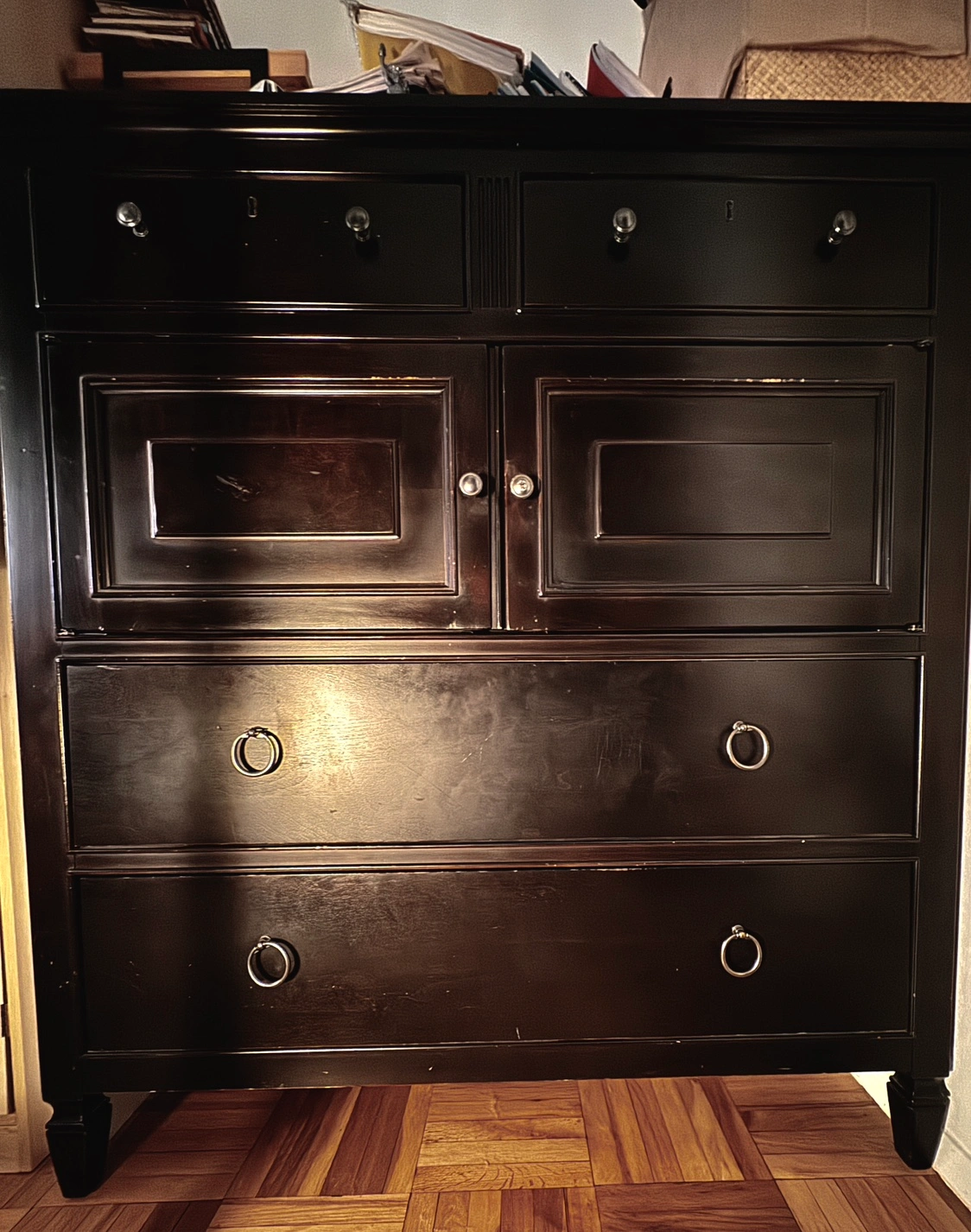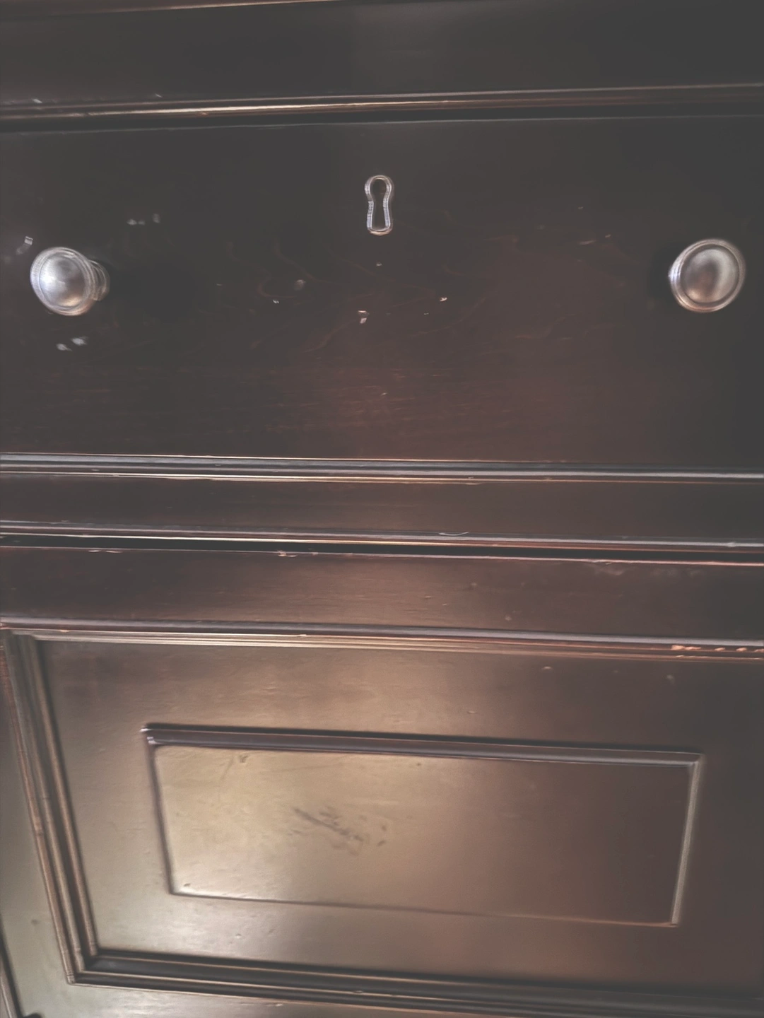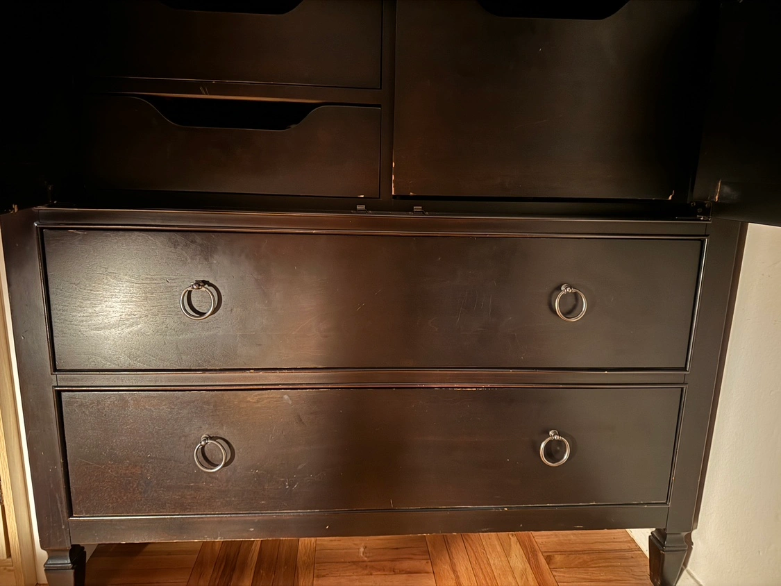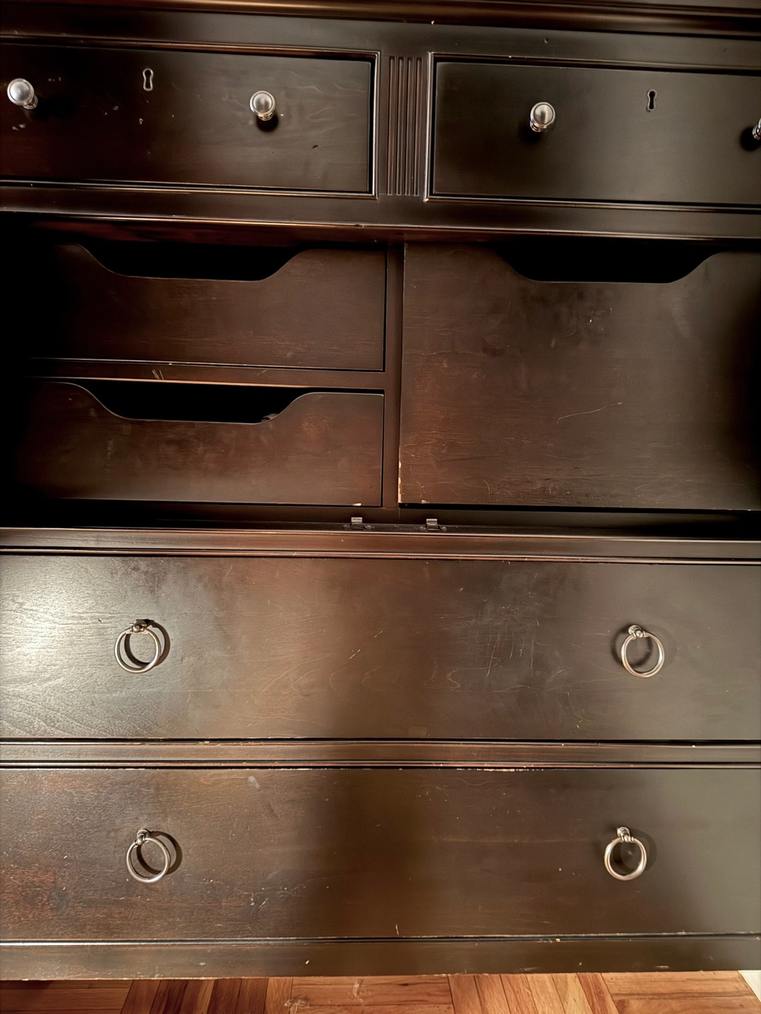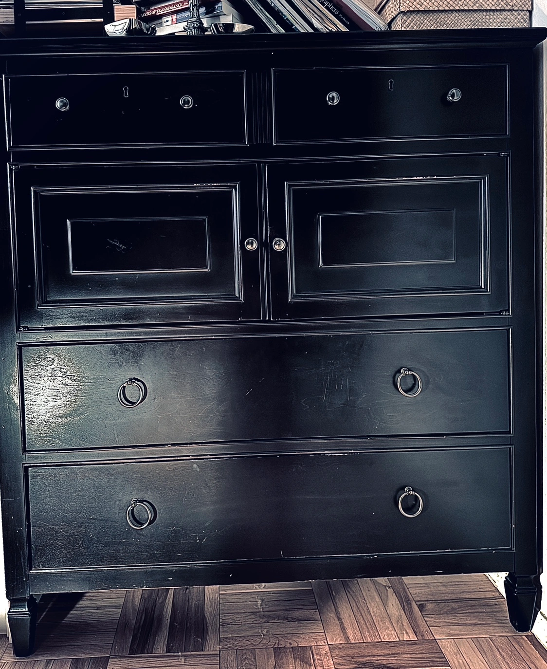 441Gentlemen’s style dresser in good condition, but it does have some scratches and nicks. It has two top drawers, two cabinet doors with shelves, and three larger drawers. Feel free to ask questions. Pick up is necessary. It requires 2 people to transport it. Middle doors are 19 inches long when opened. The handles and knobs are bronze with black. Feel free to ask questions.