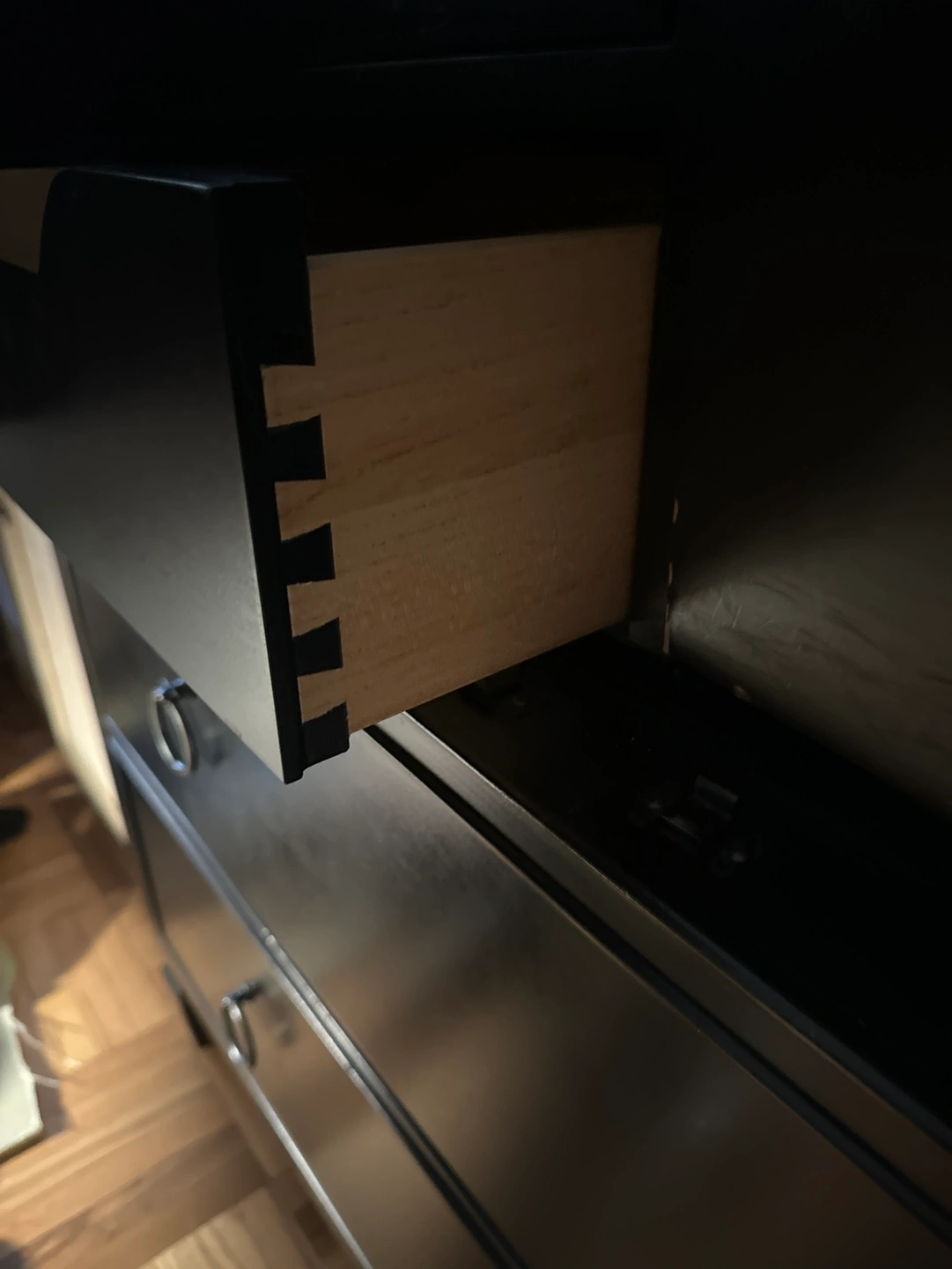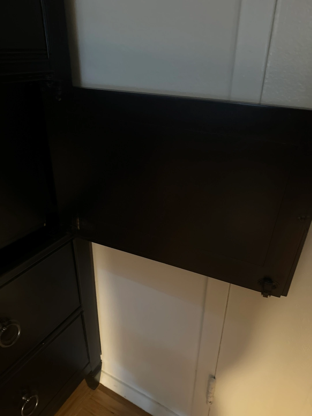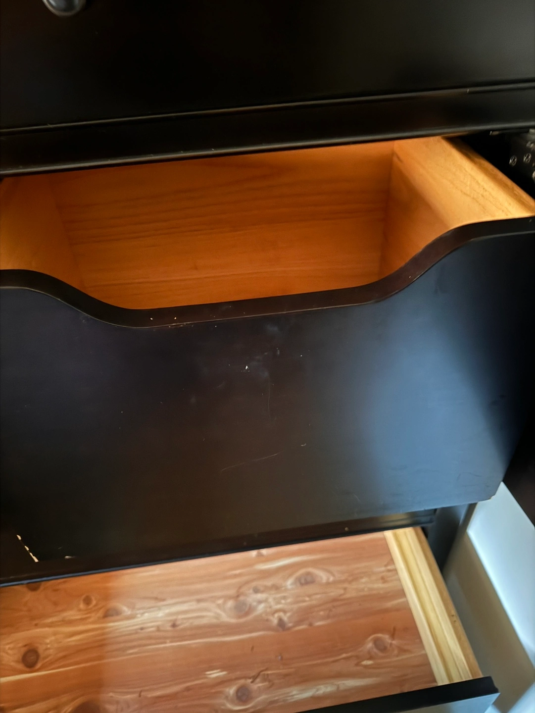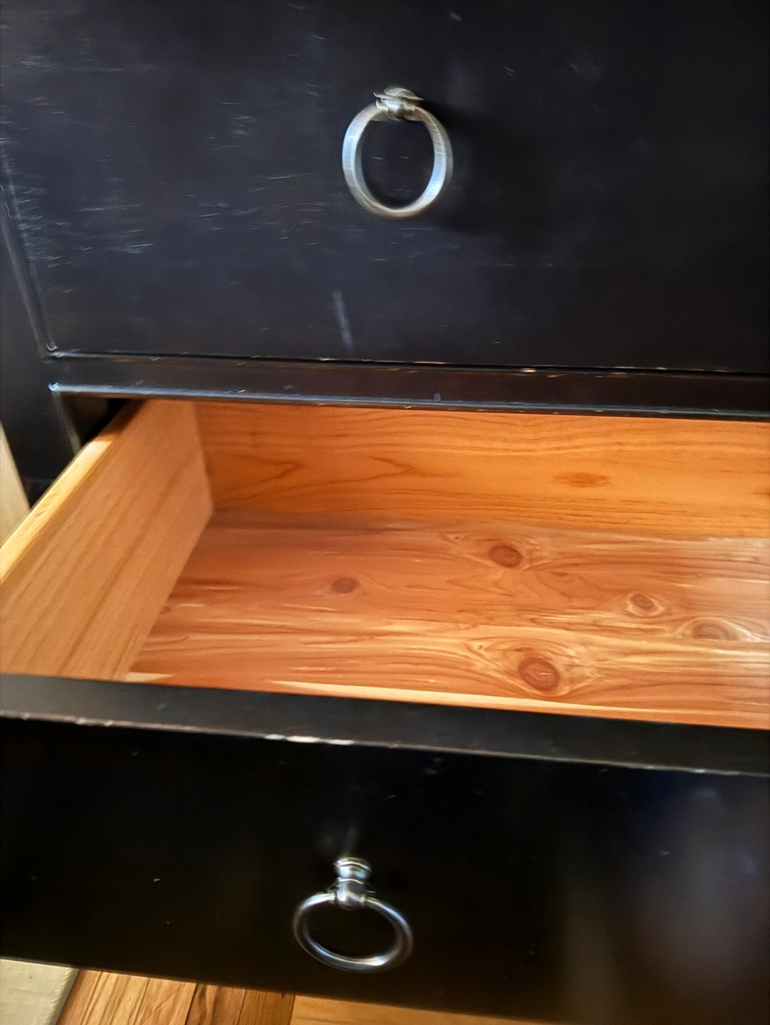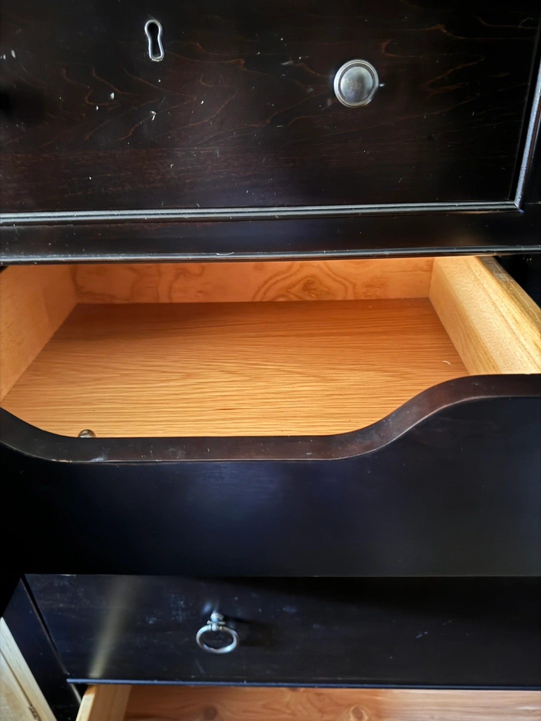 441Gentlemen’s style dresser in good condition, but it does have some scratches and nicks. It has two top drawers, two cabinet doors with shelves, and three larger drawers. Feel free to ask questions. Pick up is necessary. It requires 2 people to transport it. Middle doors are 19 inches long when opened. The handles and knobs are bronze with black. Feel free to ask questions.
