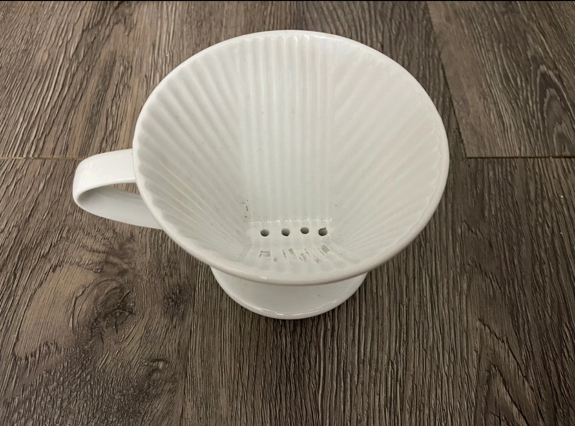 This is a white ceramic coffee dripper with a handle. It has a base and a flat bottom. There are four small holes at the bottom of the dripper for water to flow through.