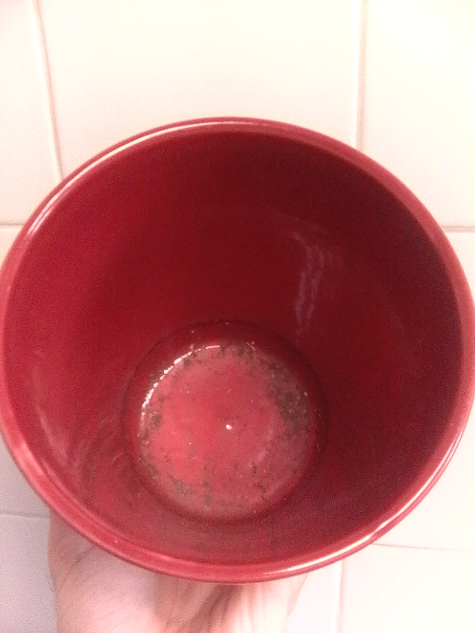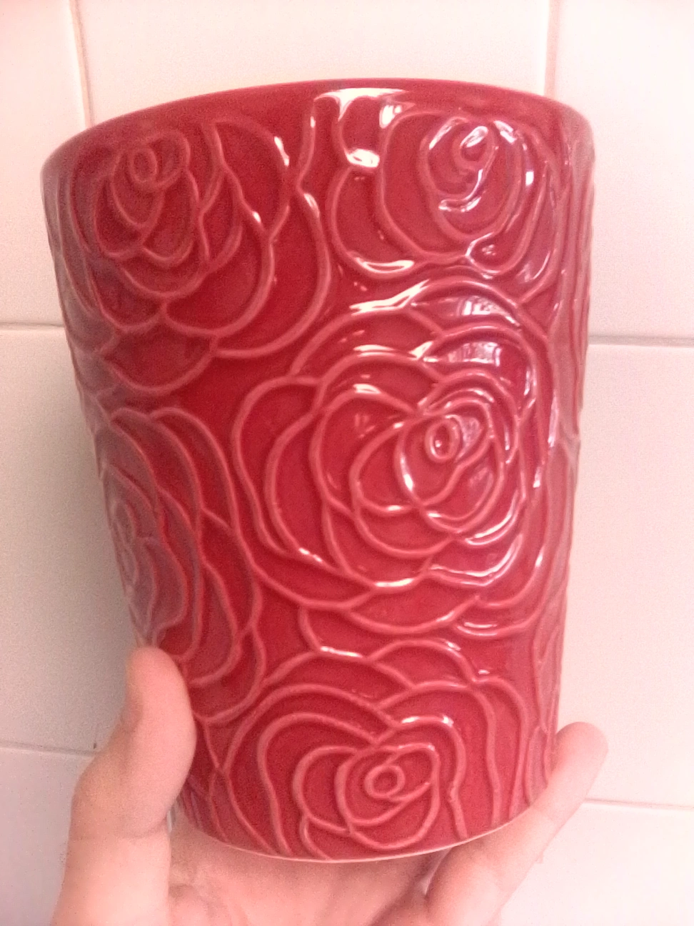 A red ceramic flower pot with a rose design. It is approximately 6 inches in diameter at the top and 4 inches in diameter at the bottom. It is approximately 5 inches in height.