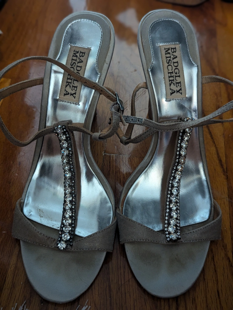 Beige heeled sandals with rhinestone embellishment. Sandal straps are adjustable. Made by Badgley Mischka. Original leather sole