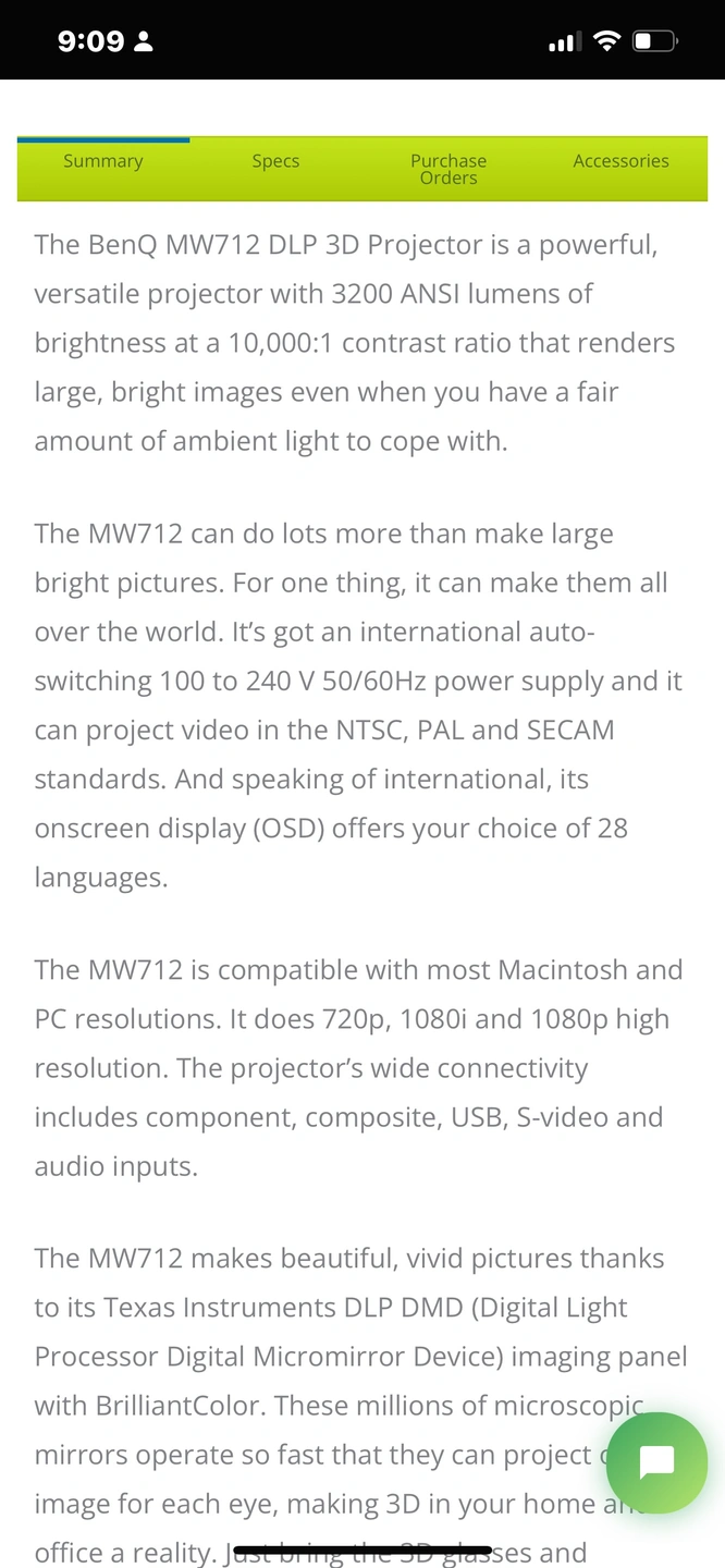 This projector is compatible with most Macintosh and PC resolutions. It does 720p, 1080i and 1080p high resolution. The projector wide connectivity includes component, composite, USB, S-video and audio inputs.