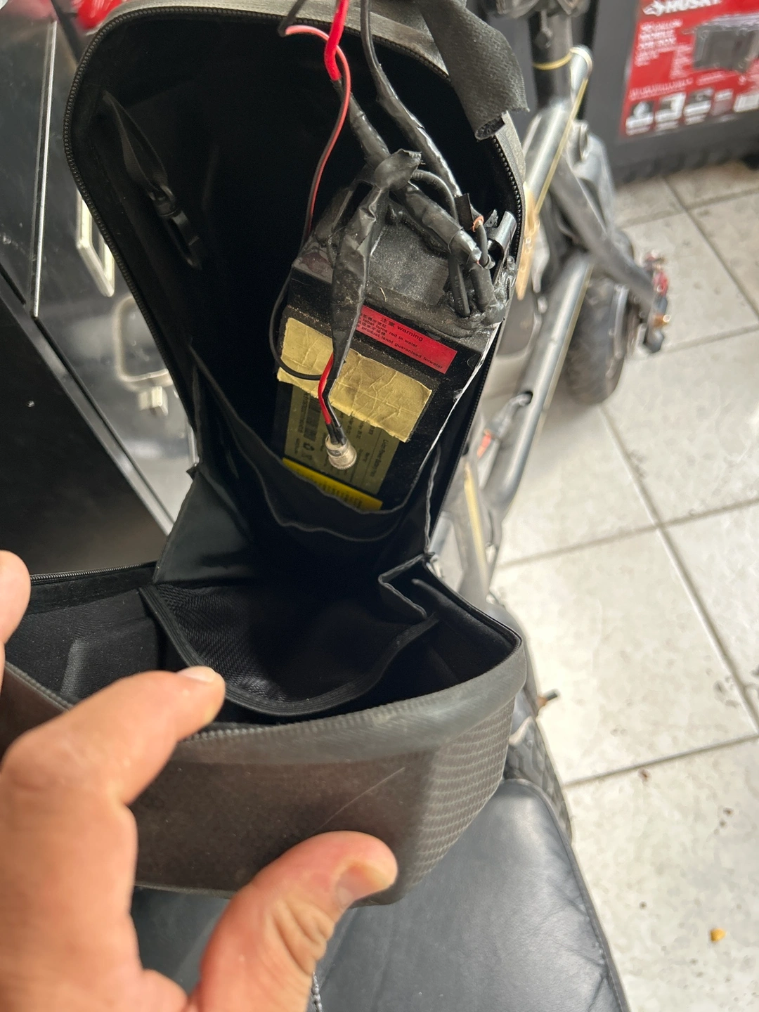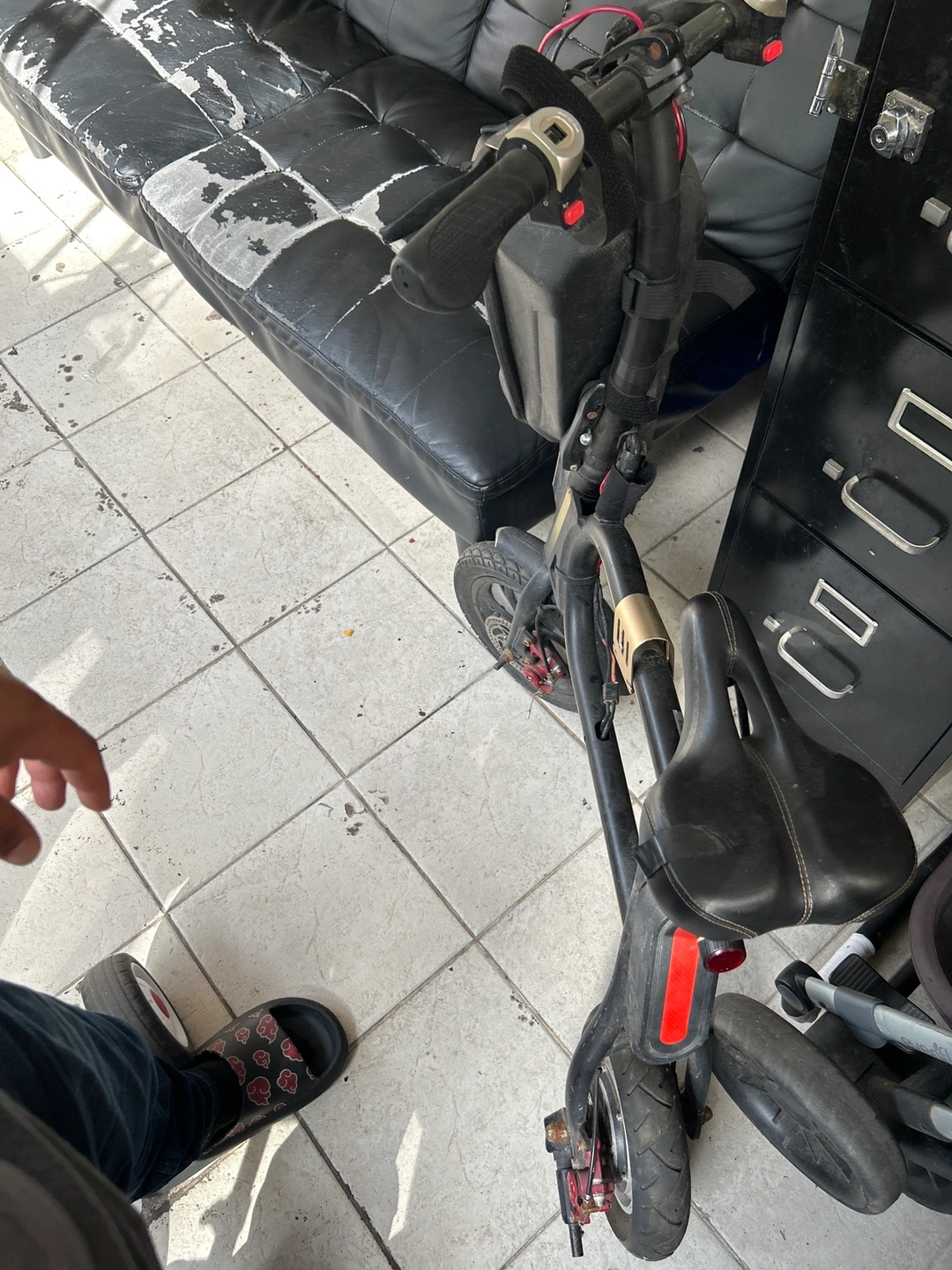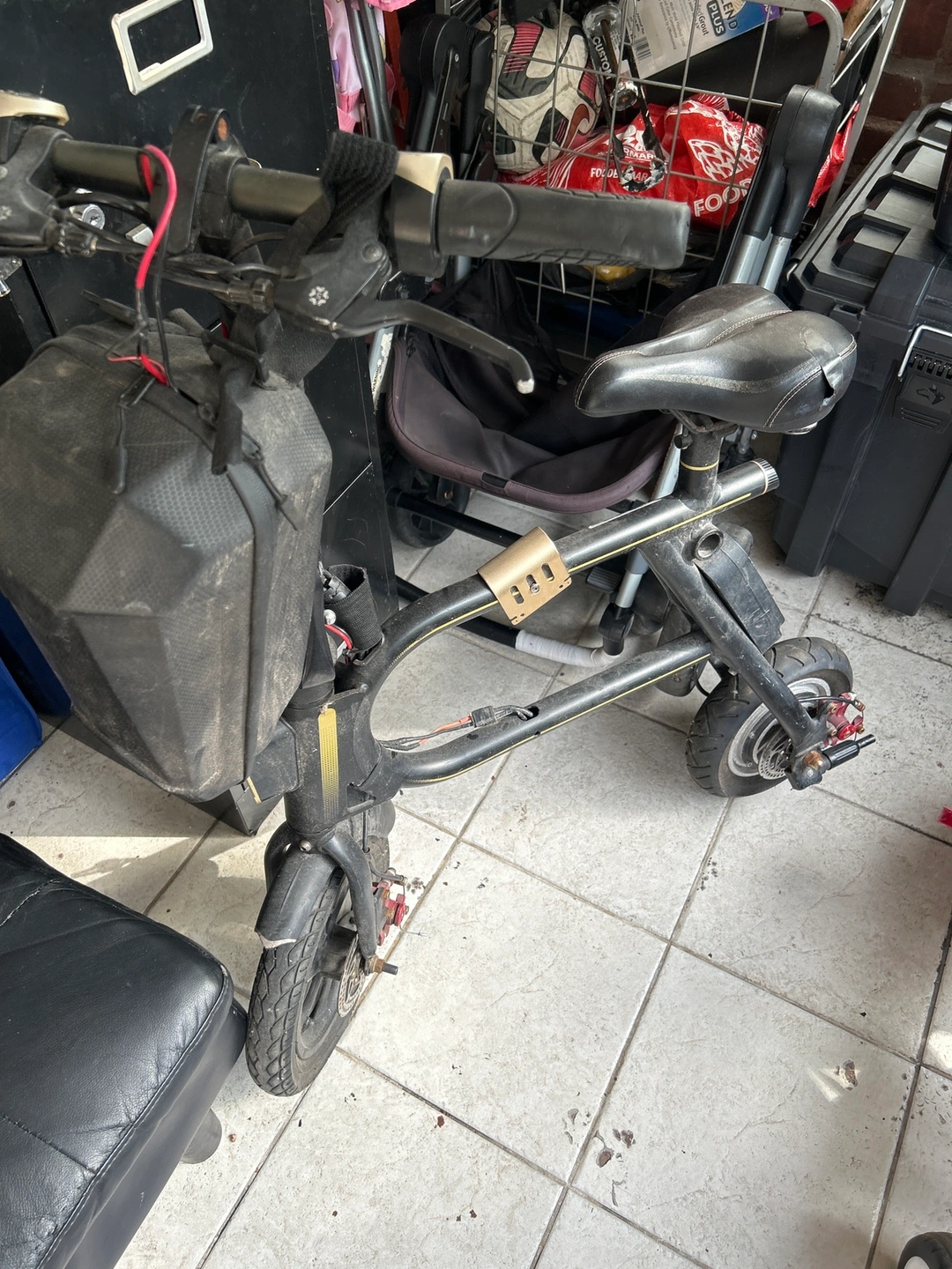 110Small electric bike with a removable battery. Includes a carrying case and a seat. It has a throttle and pedal assist.