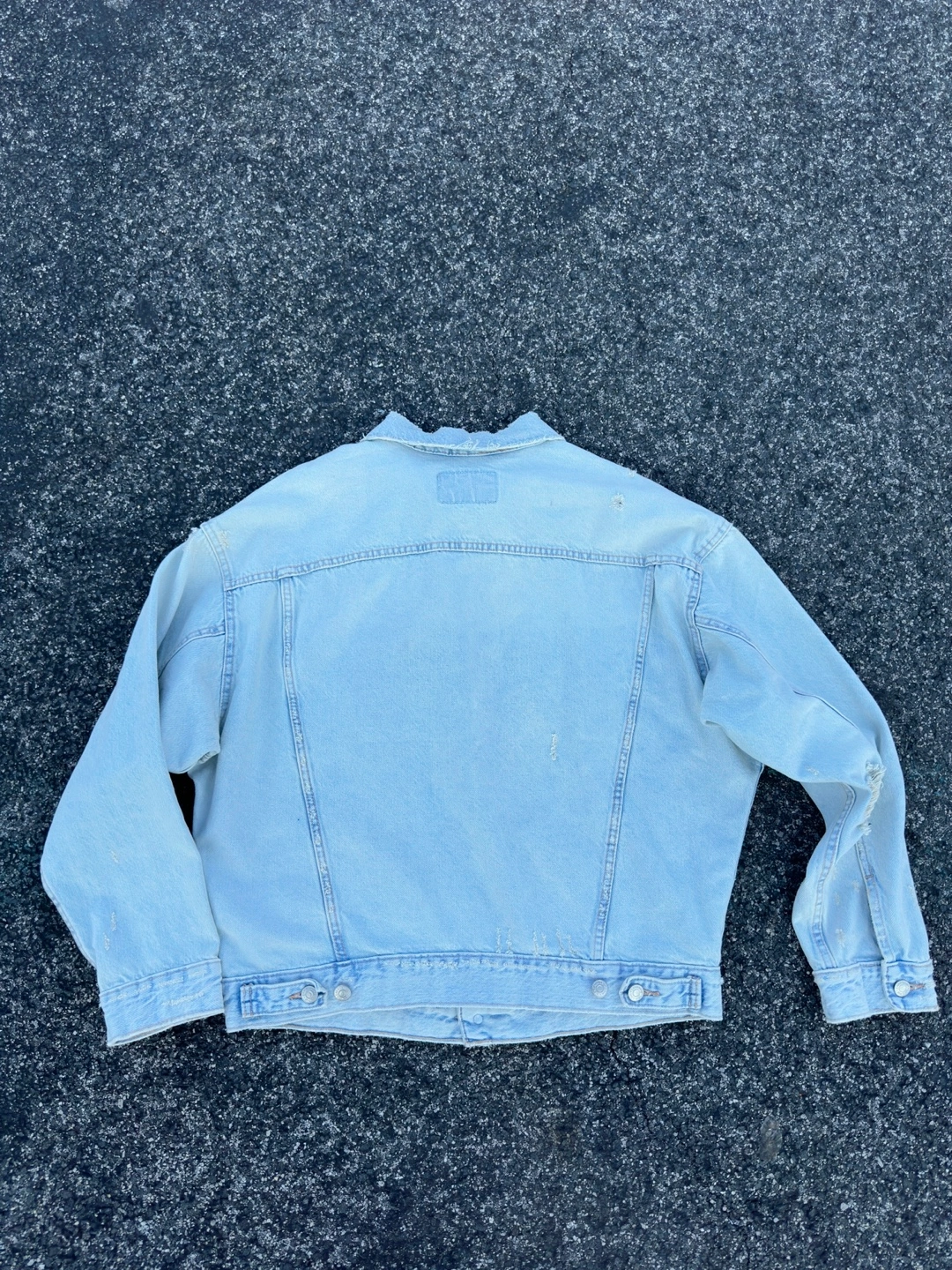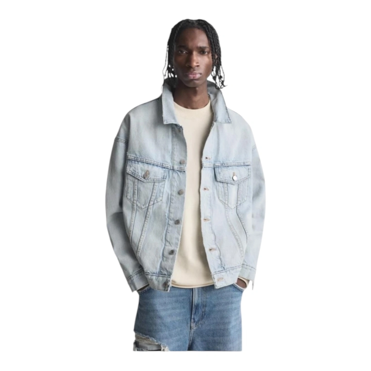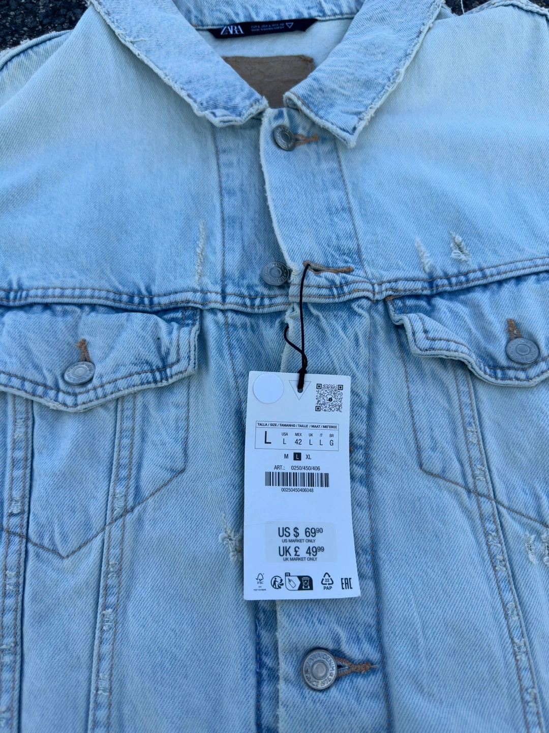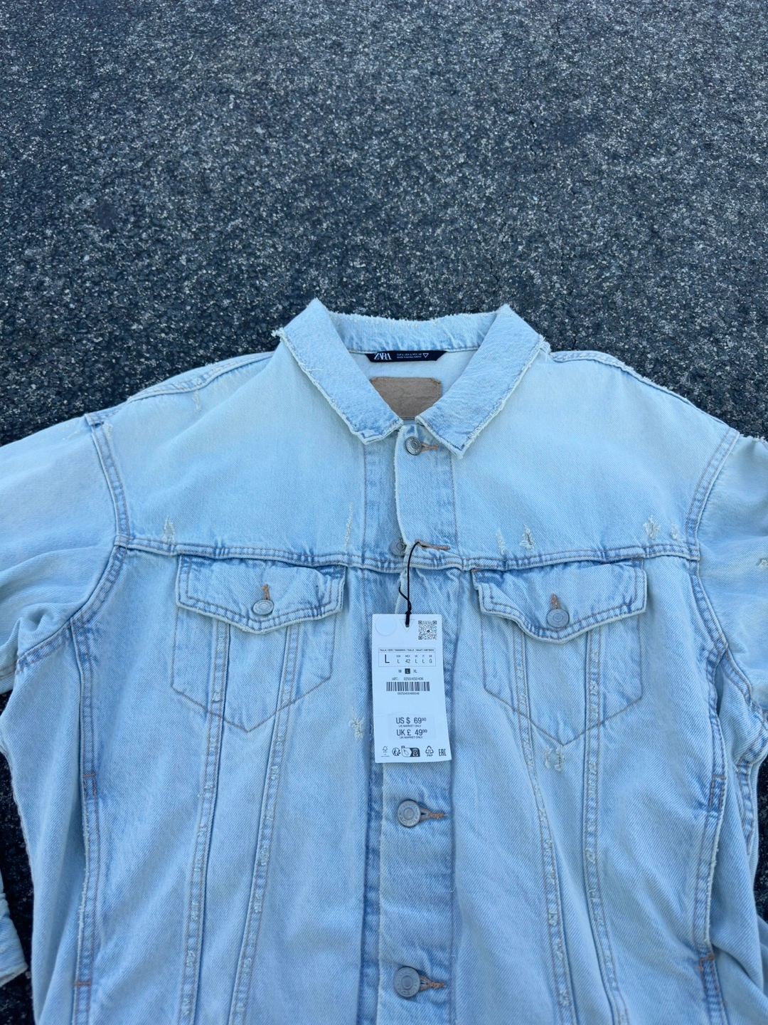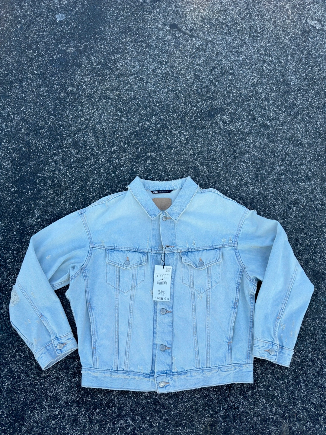411Light blue distressed denim jacket from Zara. The jacket has a classic trucker style. It features a button front closure and a relaxed fit. The jacket has several distressed details, including rips, tears, and fading.