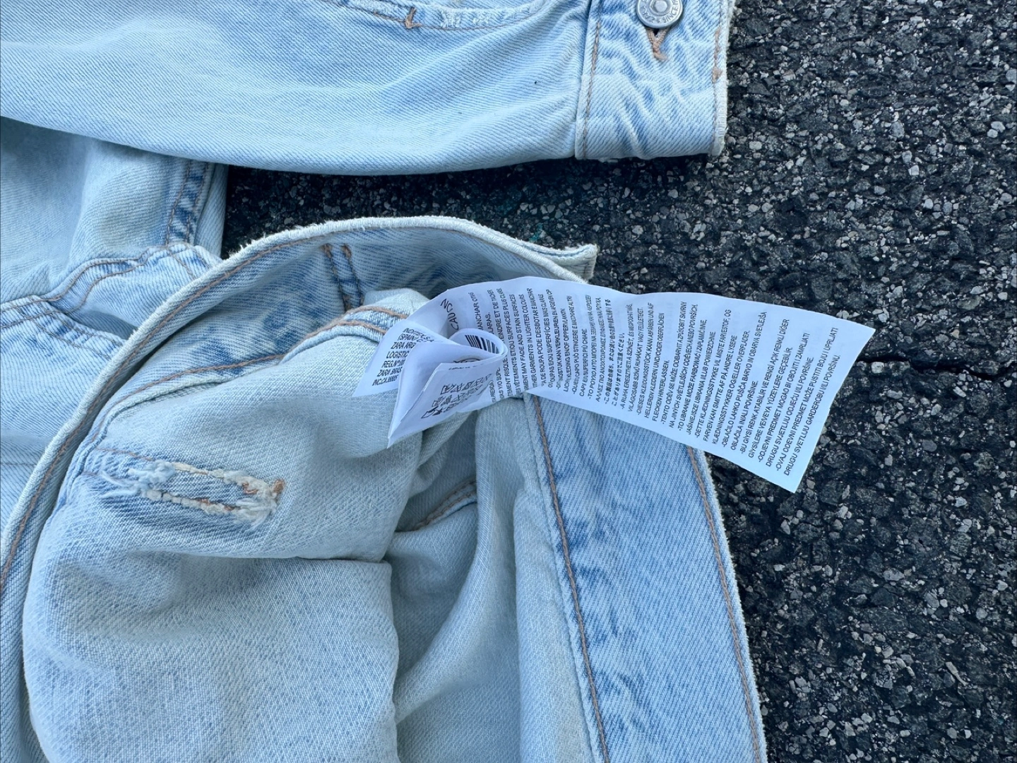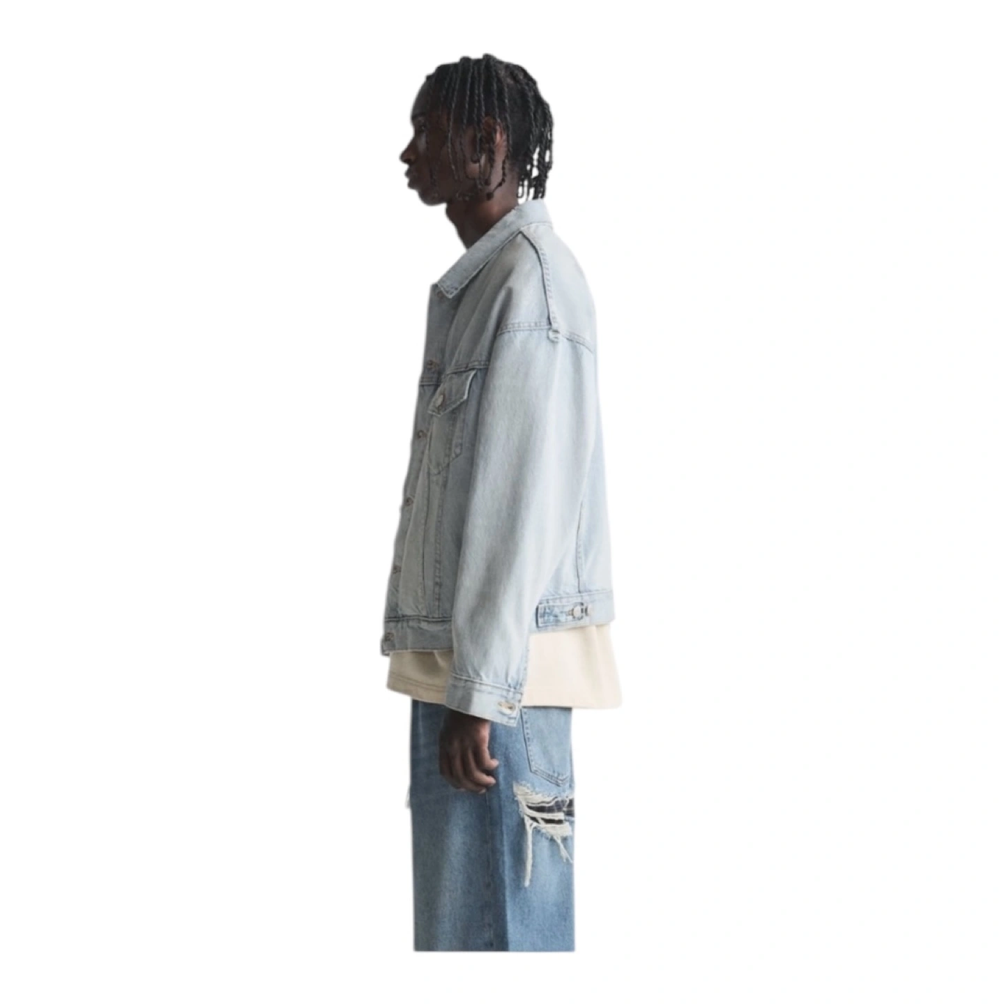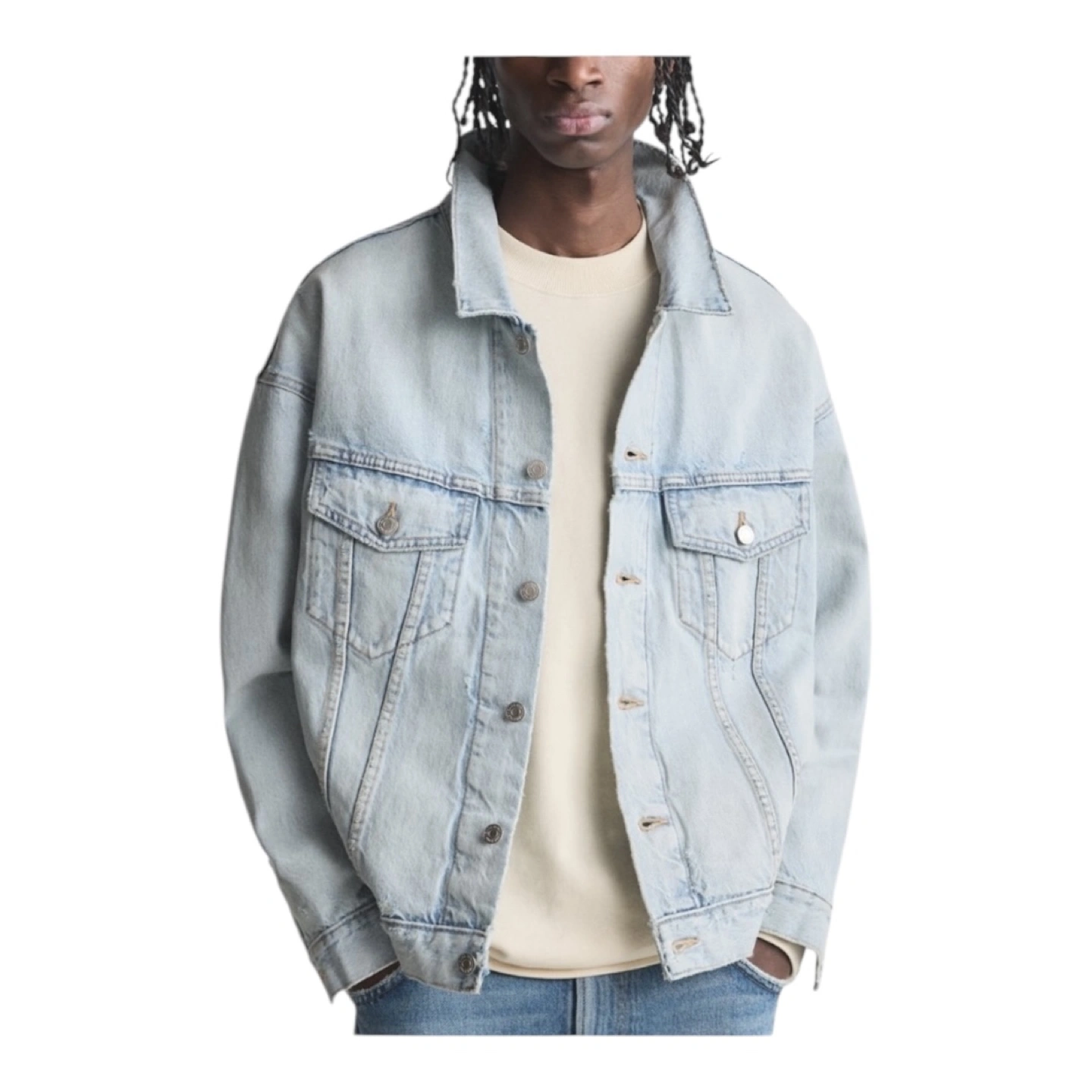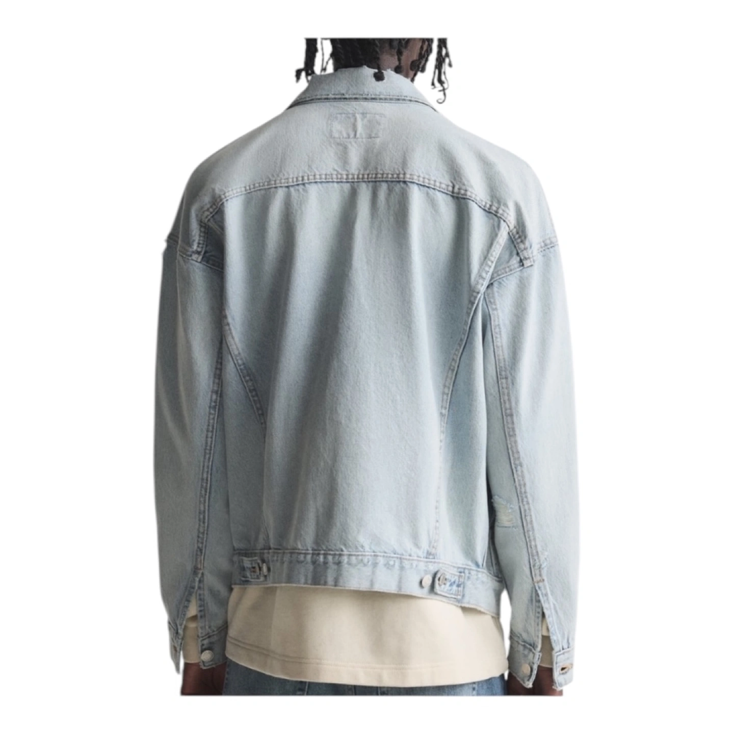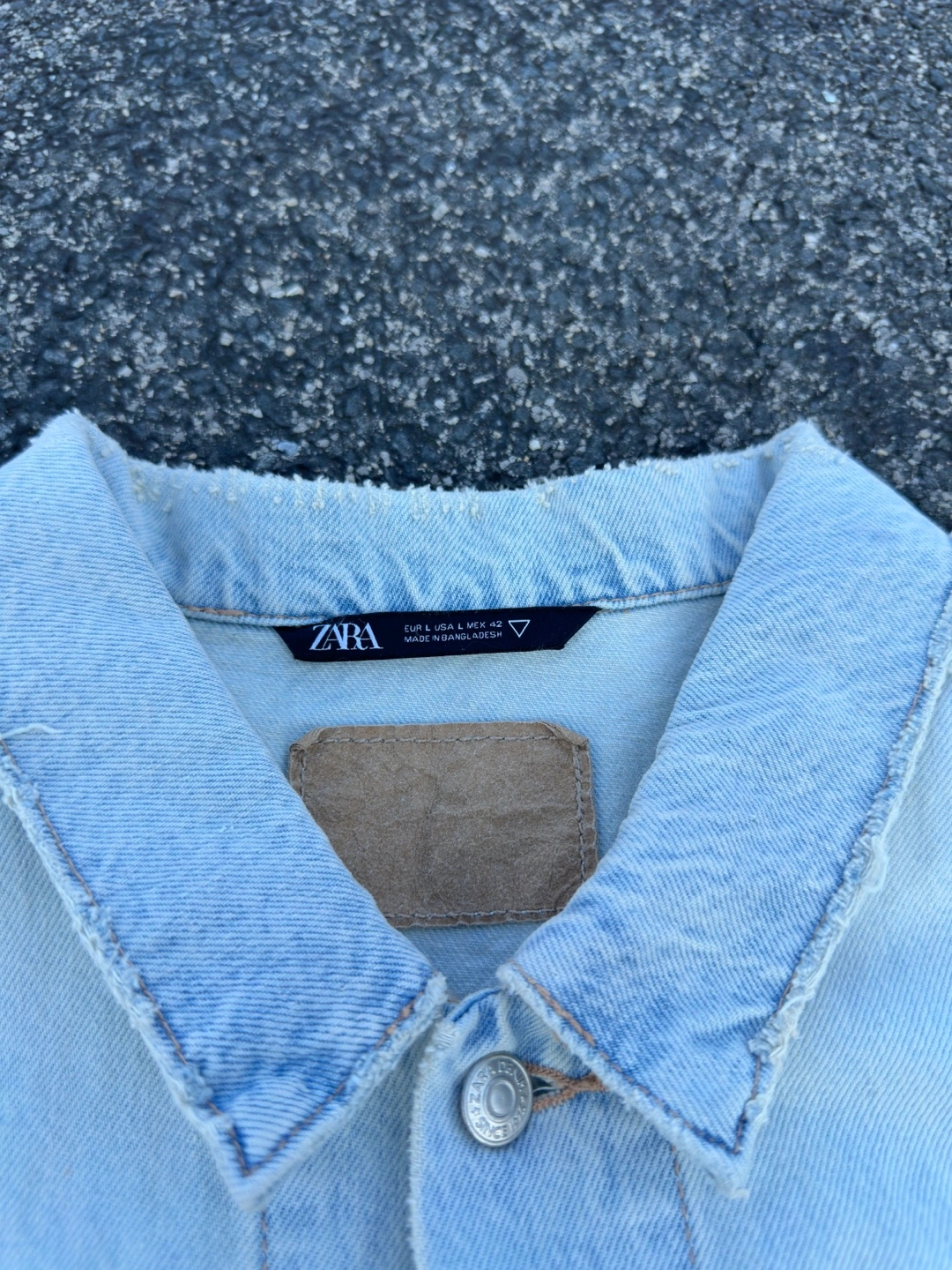 411Light blue distressed denim jacket from Zara. The jacket has a classic trucker style. It features a button front closure and a relaxed fit. The jacket has several distressed details, including rips, tears, and fading.