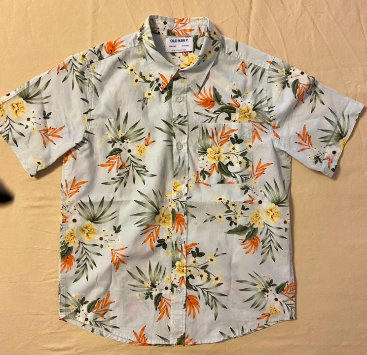 1000+Boy’s size L (10-12), short sleeve, light green with orange and yellow flowers. Never worn.