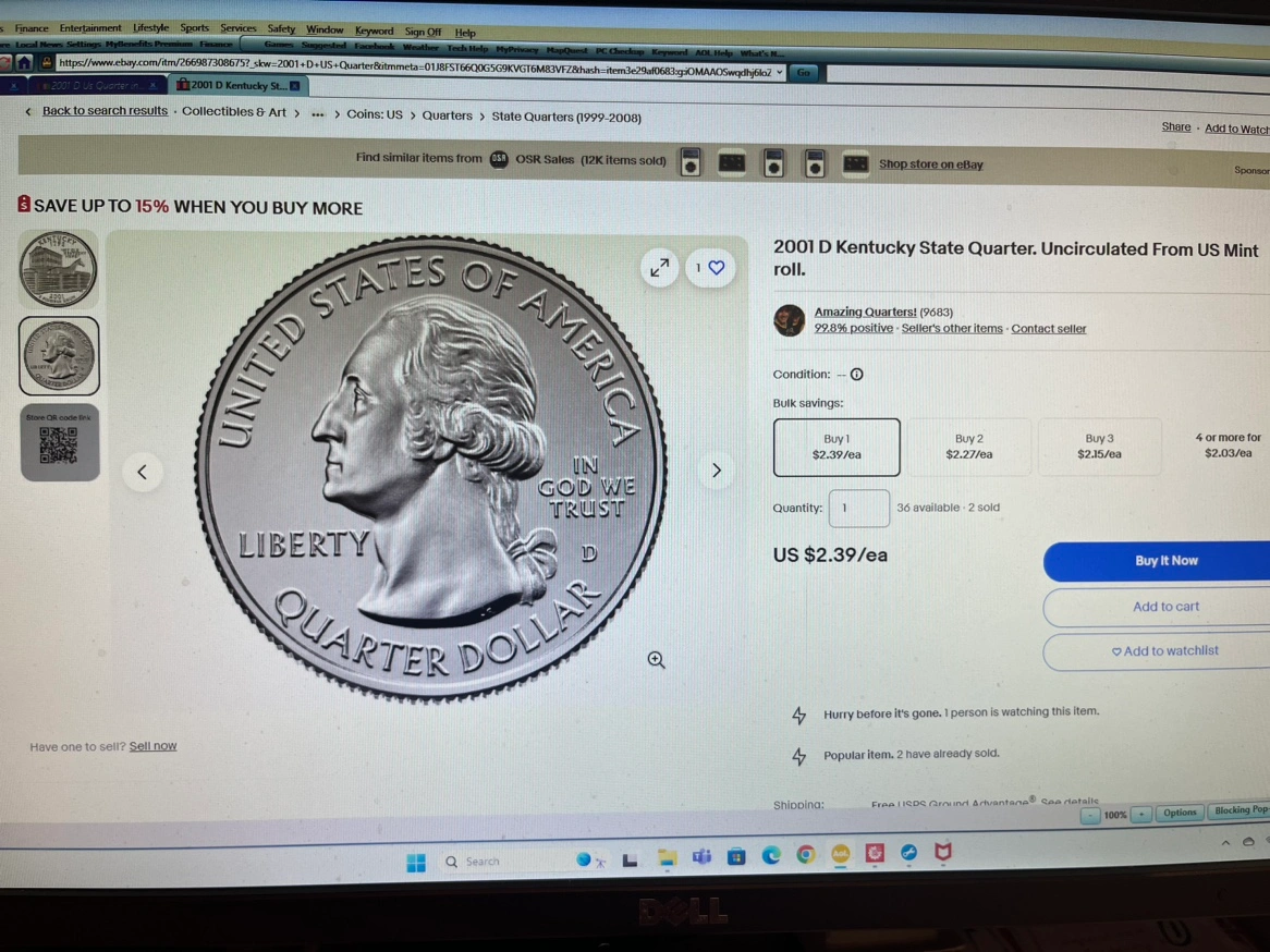 98Uncirculated 2001 D Kentucky State Quarter in a plastic coin capsule. The coin is part of the 50 State Quarters program. The obverse of the coin features George Washington. The reverse of the coin features the Kentucky State Capitol building in Frankfort, Kentucky, with a racehorse and a fence. The inscription on the reverse of the coin is "Kentucky 1792 The Old Kentucky Home." Ave U - Mill Basin Brooklyn Local Pickup Only