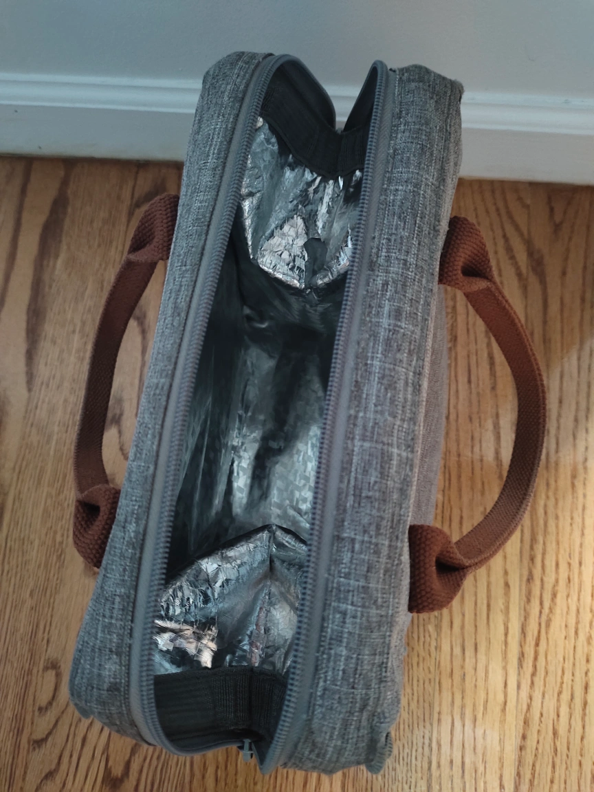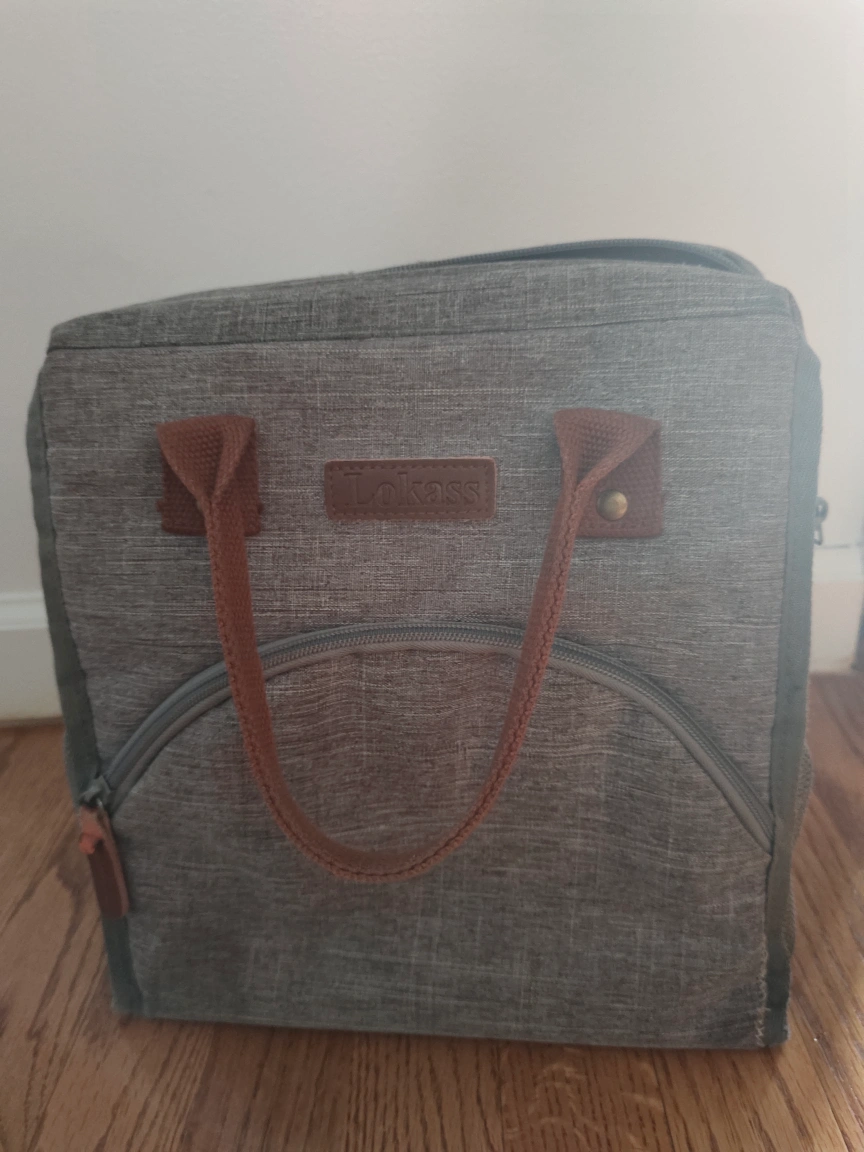 A grey lunch bag with a brown handle. It has a zipper closure. #freecycle