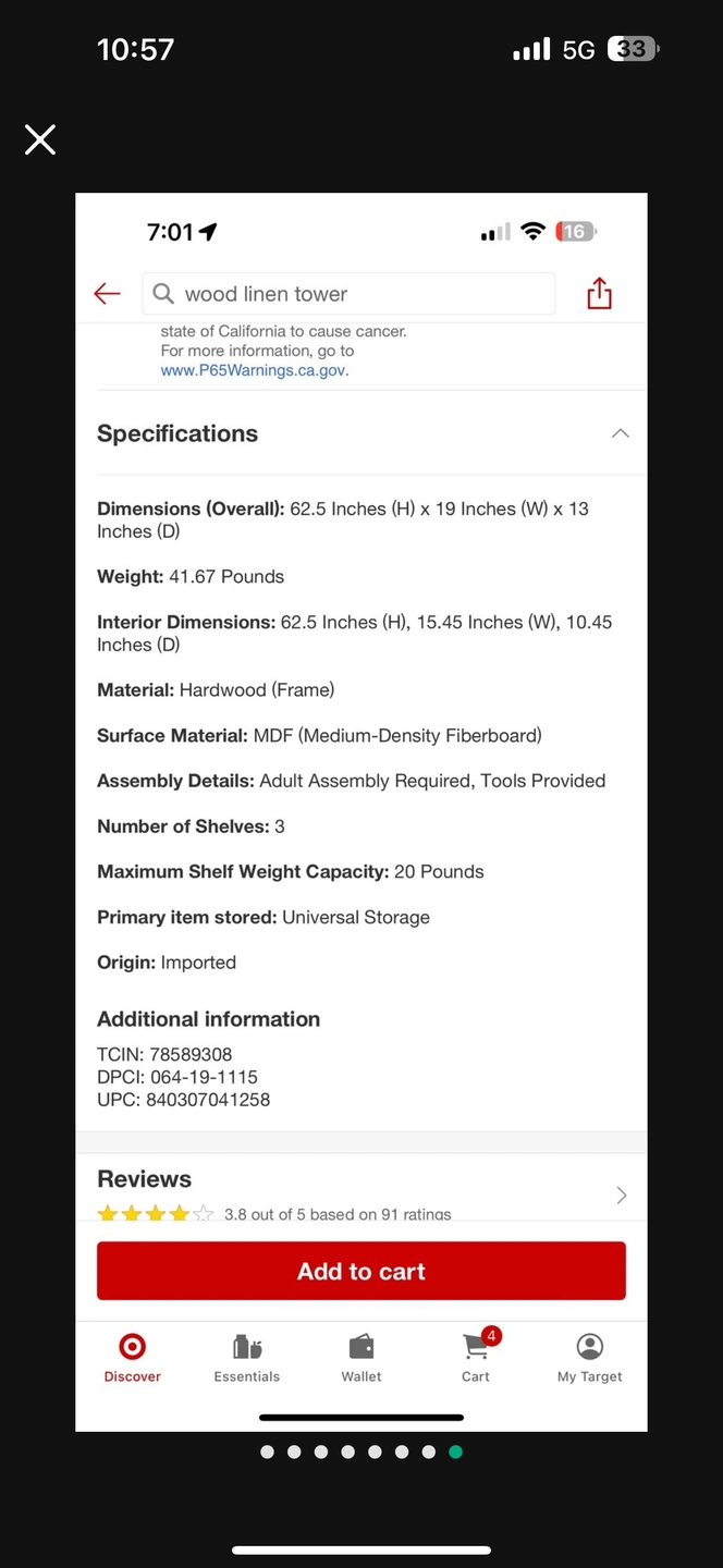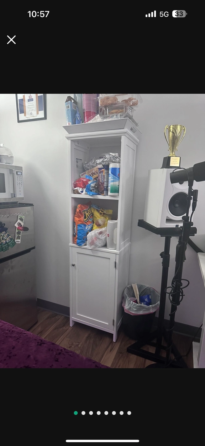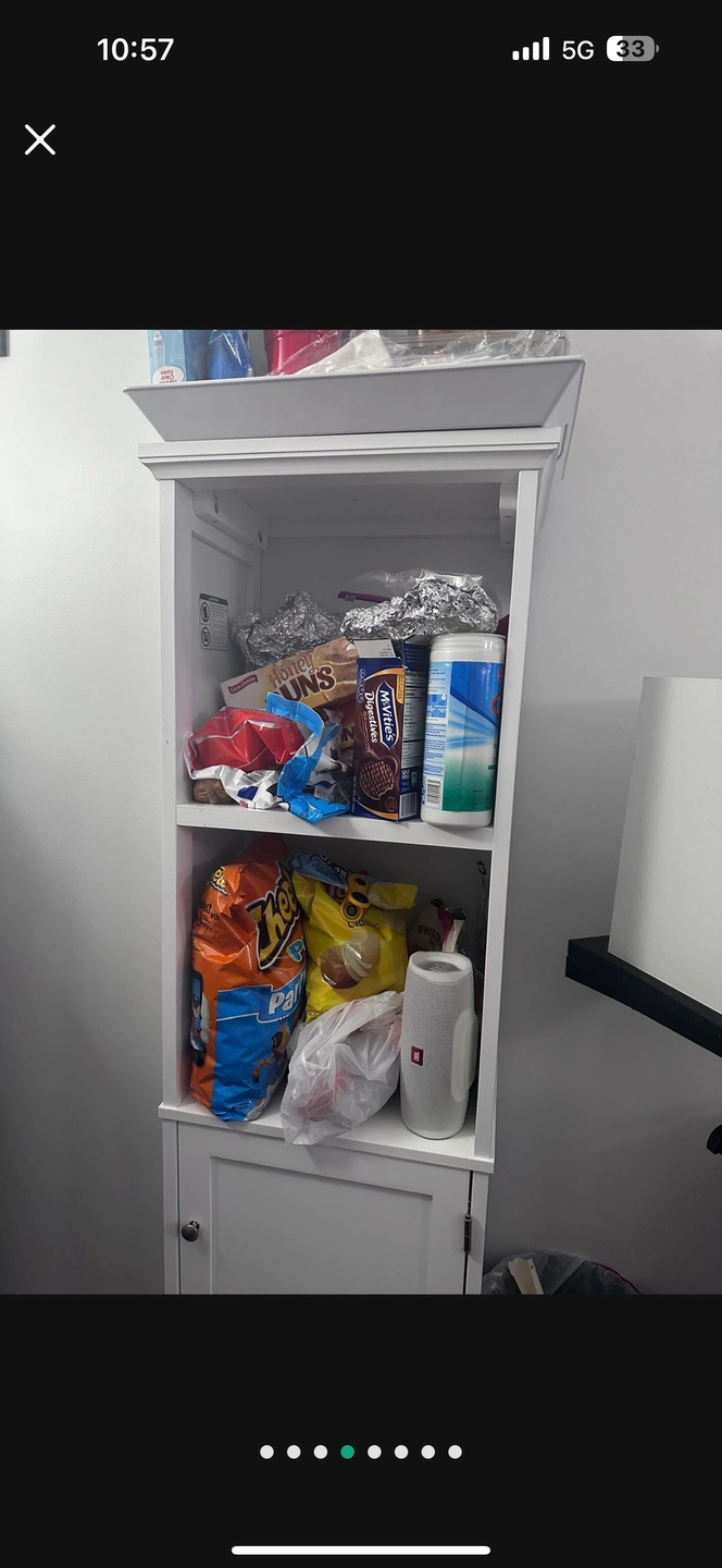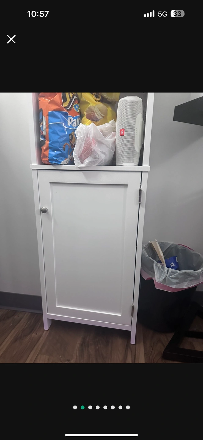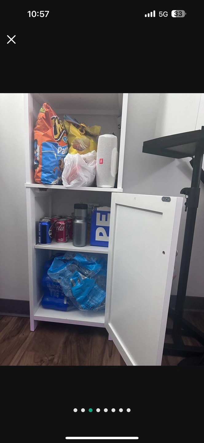 White cabinet with two shelves and a lower cabinet with a door. The top shelf is open and the middle shelf is open. The lower cabinet has a door that opens and closes. The cabinet is made of wood.