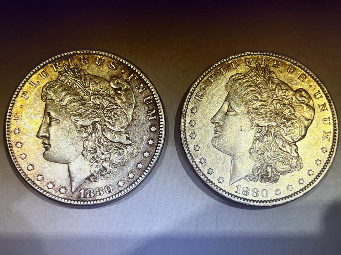 Two 1880 and 1880 O Morgan Silver Dollars.