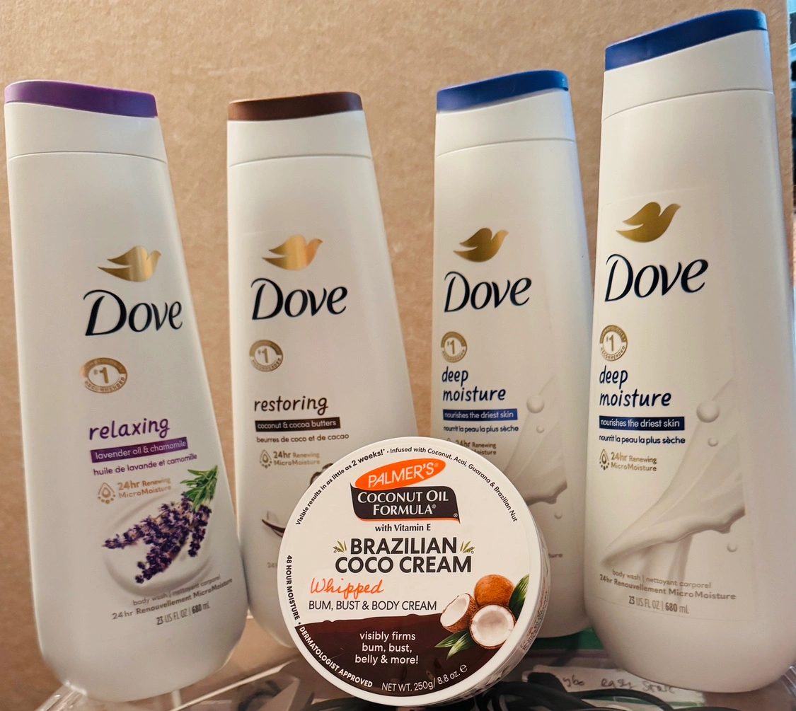 441This listing is for the following:All brand new and unopened. Bought them in bulk at BJ’s and don’t need so many 4 bottles of Dove body wash- 2-are deep moisture 1-relaxing 1-restoring 1 tub of Palmers Brazilian Coco cream Feel free to ask questions or for more pics.