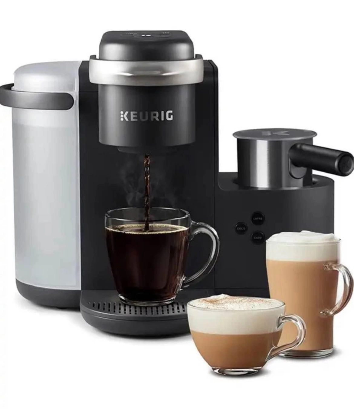 This is a Keurig K-Cafe coffee maker. It comes in a dark charcoal color. This coffee maker can make coffee, lattes, and cappuccinos. It is in new condition and comes in the original box.